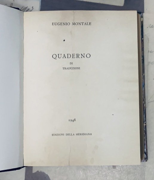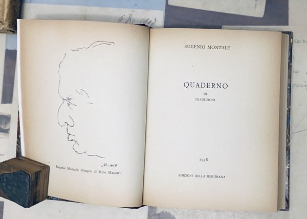 15,4x11,8 cm; 195, (9) pp. Brossura editoriale (fronte, retro e dorso) conservata entro bella legatura della seconda metà del XX° secolo in mezza pelle con dorso a 4 frego e titolo e fregi in oro ai tasselli. Piatti foderati con carta marmorizzata. Una piega al piatto anteriore della brossura editoriale, non significativa, leggerissimo ingiallimento del margine esterno delle pagine, ininfluente e per il resto esemplare in buone-ottime condizioni di conservazione. Un disegno di Mino Maccari con profilo di Eugenio Montale in antiporta. Esemplare numero 298 su una tiratura di 1621 esemplari. Prima edizione di questa raccolta di traduzioni di Eugenio Montale. "abbastanza comune ma molto ricercato, uno dei volumi più ambiti tra le edizioni di Eugenio Luraghi" Gambetti Vezzosi 2007 pagina 551.