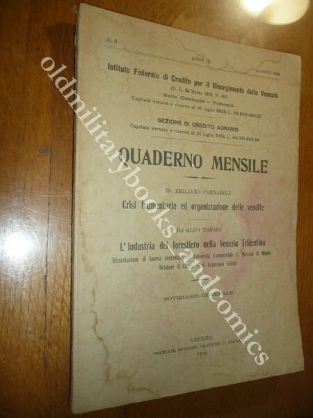 TITOLO: QUADERNO MENSILE CRISI FRUMENTARIA ED ORGANIZZAZIONE DELLE VENDITE - L'INDUSTRIA DEL FORESTIERO NELLA VENEZIA TRIDENTINA DESCRIZIONE: Officine Grafiche Ferrari Venezia 1924, br. ed. pp. XXXIV+ 54 e 3 tabelle a fine vol. in 8°. CONDIZIONI: Discrete vol. con macchie. PESO / WEIGHT: 200 gr. without package