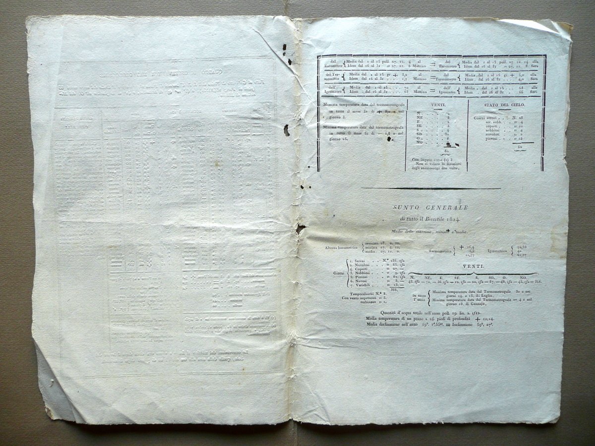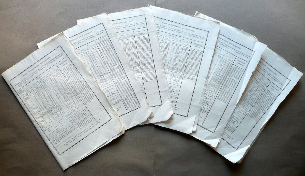 Sei moduli a stampa, Quadro di osservazioni meteorologiche Fatte al Gabinetto di Fisica dell' I. R. Università di Pavia elevata sopra il livello del mare [.] - Sei moduli a stampa Relativi ai mesi di luglio, agosto, settembre, ottobre, novembre e dicembre Anno 1824 Senza dati tipografici, Pavia 1824; sei moduli a stampa su bifolio, ognuno relativo a un diverso mese dell'anno (per un elenco dei mesi vedi titolo); testo alla prima e alla terza facciata. Margini alla forma. Cm 35,5x23,5. Condizioni di conservazione Esemplari tutti ben conservati con tracce d'uso, alcune minime bruniture e poche piccole lievi ombre di gore che non interessano il testo; margini e angoli di qualche modulo con pieghette o tracce di pieghette; modulo del mese di dicembre con alcune piccole mancanze che interessano marginalmente pochi caratteri ma che non impediscono la comprensione del testo (vedi foto). Interessanti le osservazioni generali riportate al termine di ogni giorno, nelle quali sono segnalati i fenomeni atmosferici più rilevanti. SC03.D11539 N