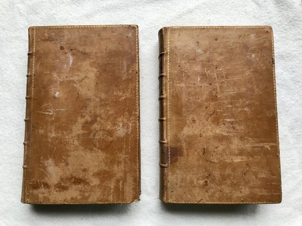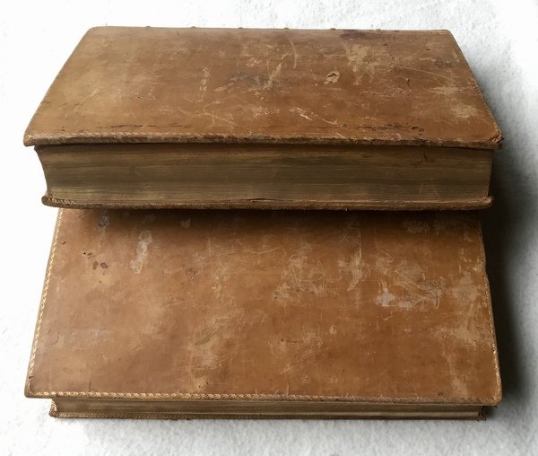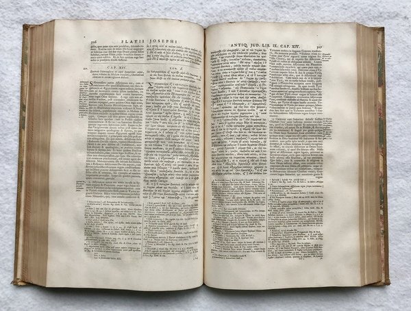 In-folio, 2 voll.: (6), 28, (28), 982; (2), 520, 481, (63). Bella legatura color nocciola in pieno vitello, elaborate cornici in oro ai piatti, ricchi fregi geometrici in oro al dorso, arrotondato e a sei nervature, con titoli e tomaison impressi su doppio tassello in marocchino marrone. Morsi ed unghiature decorate in oro. Tagli dorati, sguardie marmorizzate e segnacoli di seta rossa. Al primo volume, doppio frontespizio, uno calcografico inciso in rame a tutta pagina da Peter Van Gunst ed il secondo in rosso e nero con piccolo fregio in legno, più due c. di tav. fuori testo raffiguranti monete antiche; occhietto ed una c. di tav. fuori testo ripiegata più volte con l’albero genealogico della famiglia di Erode al secondo volume. Alcune illustrazioni nel testo, finalini e capilettera ornati, testo greco e latino su doppia colonna, un poco di arabo ed ebraico, note laterali stampate in margine. Lembo bianco inferiore del frontespizio calcografico restaurato, qualche fascicolo leggermente brunito al secondo volume, altrimenti una copia molto fresca e pulita, con buoni margini. Angoli con segni d’usura, piatti con abrasioni e qualche macchia. Una buona copia in elegante legatura.