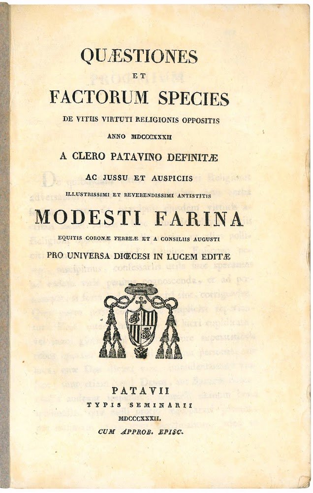 Quaestiones et factorum species de vitiis virtuti religionis oppositis anno MDCCCXXXII a clero patavino definitae ac jussu et auspiciis ... pro universa dioecesi in lucem editae.
