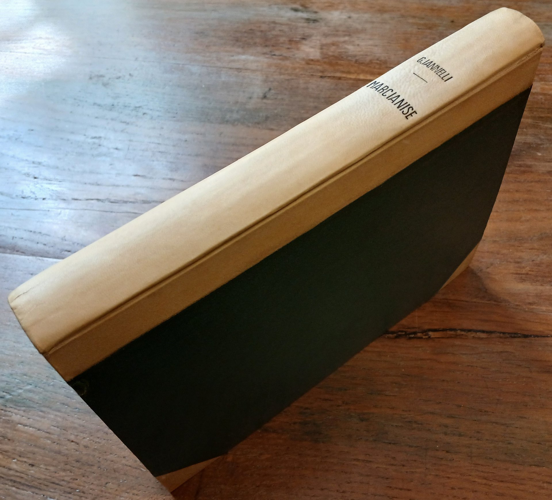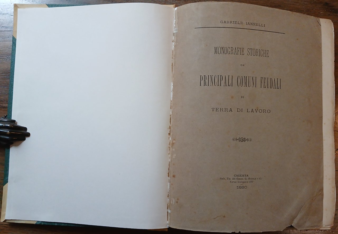 "Opera, che al tempo stesso mette in rilievo i fasti dell'antico Principato Capuano, poi Terra del Lavoro, sopratutto rappresentato da' 26 Comuni e Frazioni degli attuali Mandamenti di Capua, S. Maria Capua Vetere, Marcianise, Pignataro Maggiore e parte del territorio di Caserta, già pertinenze della stessa Capua". In 8°, legatura in mezza pergamena con punte, titolo impresso in nero al dorso, tagli davanti e di piede in barbe, conservate le copertine della brossura editoriale, pp. (4),472, con una fotografia su carta all'albumina applicata su tavola in cartoncino ("preteso" stemma di Marcianise su cippo terminale romano) ed una tabella più volte ripiegata fuori testo. "Monografie storiche de' principali Comuni feudali di Terra di Lavoro. Marcianise rispetto a Capua". Rinforzi al margine interno della prima di copertina, della tavola e dell'occhiello con tracce di ossidazione, peraltro volume solido e ben conservato. Edizione originale.