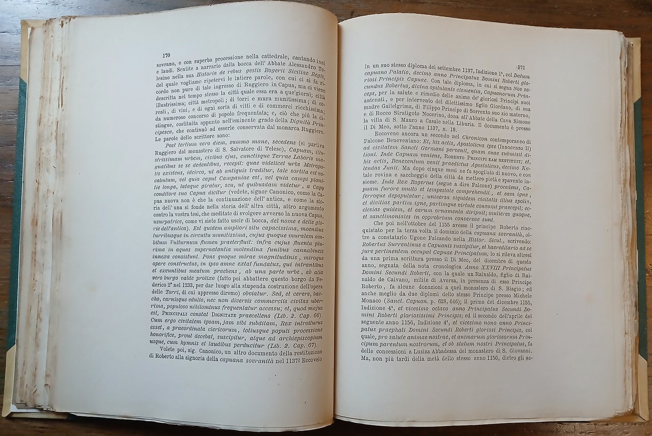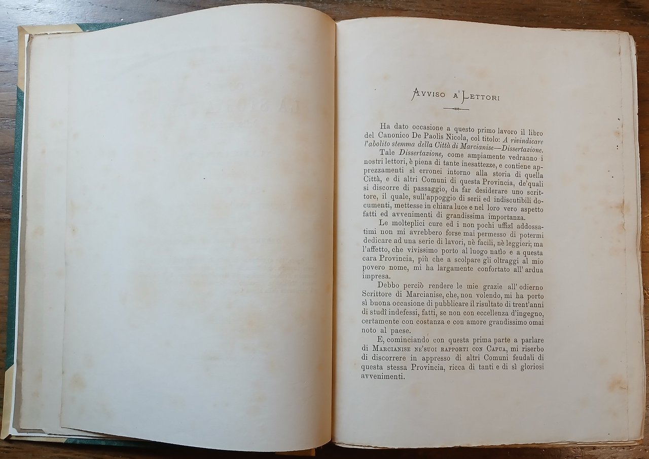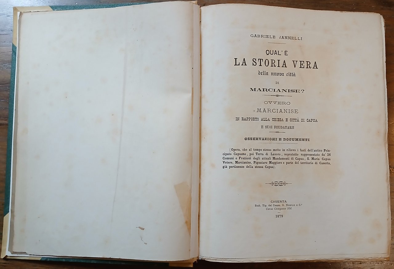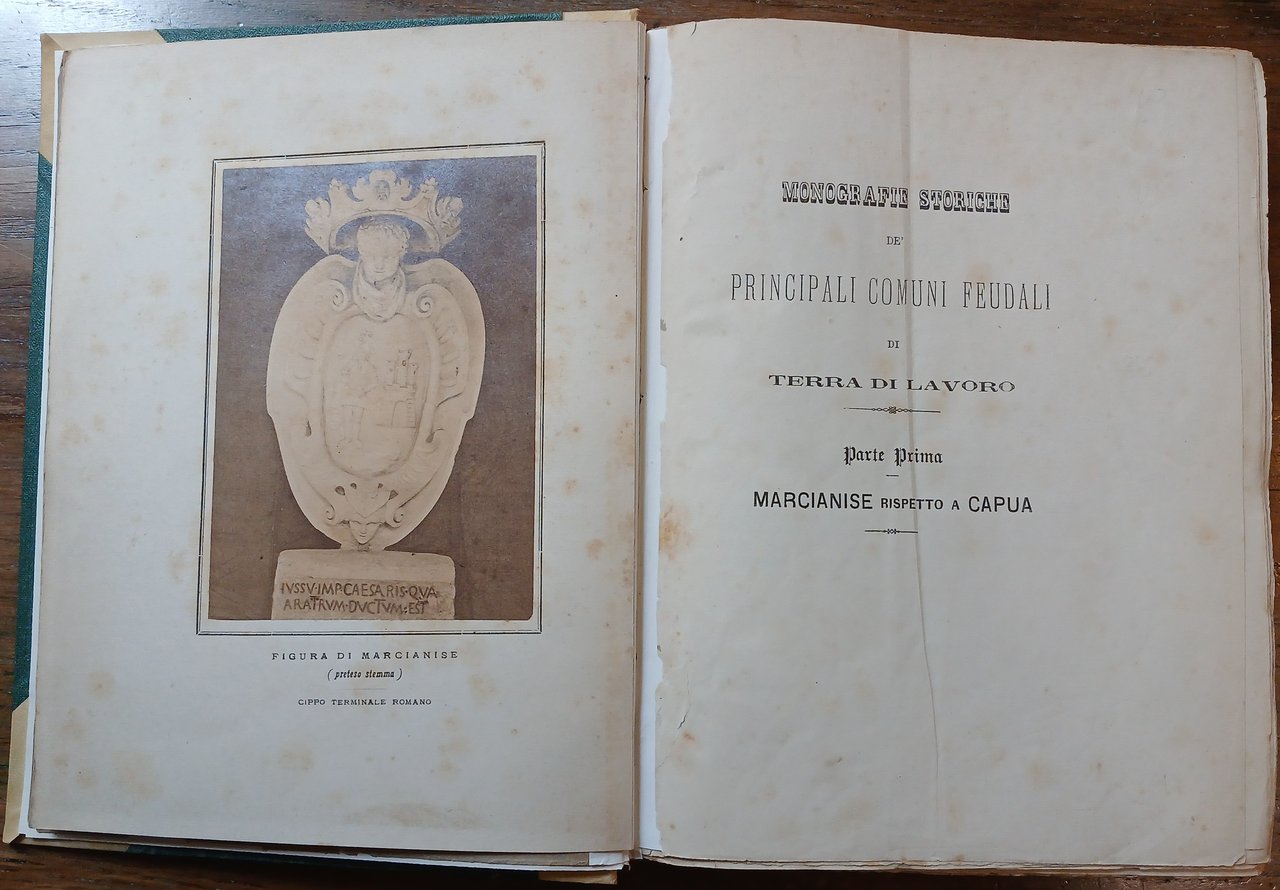 - pp. (4),472, con una fotografia su carta all'albumina applicata su tavola in cartoncino ("preteso" stemma di Marcianise su cippo terminale romano) ed una tabella più volte ripiegata fuori testo