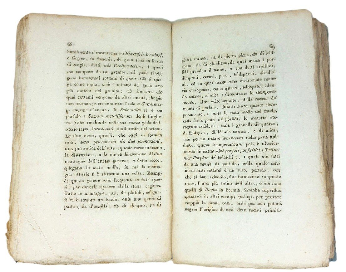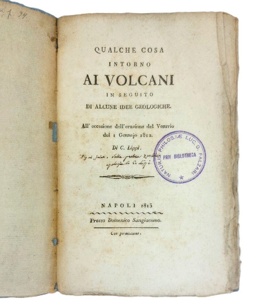 >In-8, (217x140 mm.) pp. 167, brossura coeva, titolo su tassello al dorso, in barbe. La monografie comprende alcune osservazioni filosofiche e geologiche sulla crosta terrestre e sulle rocce vulcaniche. Nel 1816, Lippi pubblicò l'opera “Fu il fuoco e l'acqua che sotterrò Pompei ed Ercolano?”, in cui sosteneva la tesi “originale” che entrambe le antiche città ai piedi del Vesuvio sarebbero state distrutte non da un'eruzione vulcanica, ma dall'acqua . Esemplare genuino con qualche arrossatura e leggera brunitura più marcata sugli ultimi 3 fogli, piccola mancanza di margine bianco a p. 166. Timbro di biblioteca privata “Natur. Philos.ae Luc. G. Falzari” (timbro circolare sul frontespizio e a p. 166). Una nota contemporanea manoscritta a inchiostro sul frontespizio. Furchheim, p. 94; Clio s.v., p. 2643.