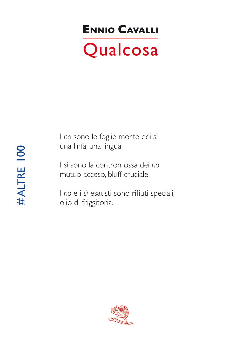 A sette anni dall’antologia "Qualcuna #Le 100 poesie", ecco "Qualcosa #Altre 100", con 15 inediti e un’ampia sintesi dei libri di Ennio Cavalli usciti dal 2016 a oggi: Vangelo di legno verde, Orfeo e il Signor Tod, Se ero più alto facevo il poeta, Amore manifesto. Serpeggiano qua e là anche i temi “caldi” di Poesie incivili (2004-2017). Uno sguardo sul mondo articolato e composito di un autore, premio Viareggio 2009, la cui voce si è fatta sempre più intensa e ascoltata a partire dall’esordio, cinquant’anni fa, con L’infinito quotidiano, tenuto a battesimo da un maestro di visionarietà e astuzie come Federico Fellini, che trovava in quell’opera «immagini suggerite da una sofferenza intellettuale e letteraria, invenzioni belle, fresche, originali». Angelo Maria Ripellino amò fin dall’inizio la poesia di Ennio Cavalli, «per l’ibrido impasto delle metafore, i trabalzi semantici dal solenne al prosaico, le smorfie grottesche, la concretezza tangibile della stesura, la ricostituzione dell’umano e soprattutto la disperata difesa della fantasia». Ha aggiunto di recente Dacia Maraini: «Nella poesia di Cavalli c’è un umorismo alla Ionesco, assieme a una continua e latente corrente riflessiva, quasi uno sguardo filosofico sul circostante».