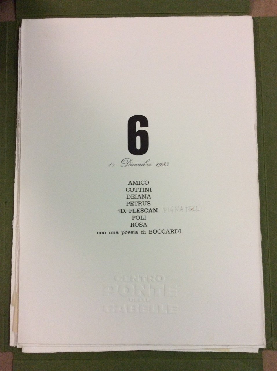 Cartella editoriale, contenente una poesia e 7 incisioni ad opera di: Amico, Cottini, Deiana, Petrus, Pignatelli, Poli, Rosa. Edizione di 66 copie numerate. In ottimo stato (nice copy).