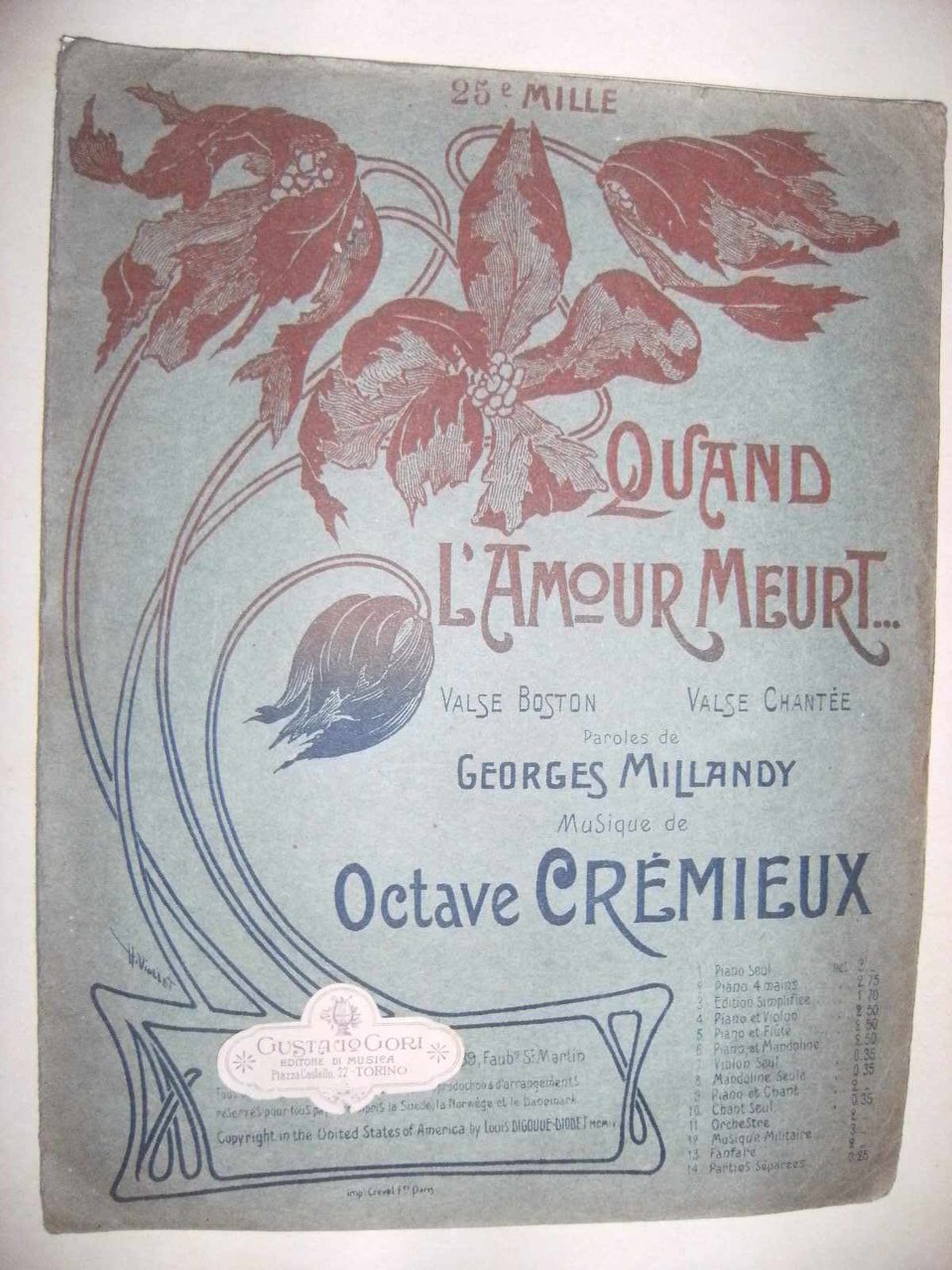 - Pagg. 4 con bella copertina Liberty e cartiglio di Gustavo Gori Editore di musica Torino