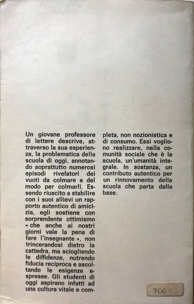 Soggetti: Pedagogia, Educazione, Formazione, Scuola, Relazioni, Insegnanti, Professori, Didattica, Docenti, Alunni, Classi, Dialogo, Memorie, Biografie, Testimonianze, Esperienze, Anni Settanta, Istruzione, Cultura, Trasmissione, Rapporto con gli studenti, Società, Giovani, Insegnamento, Materie, Nozioni, Attività extra-scolastiche, Diario, Cattedra, Interrogazioni, Esami, Lettura, Ascoltare, Allievi, Compiti, Tema, Voti, Valutazione, Promozione, Bocciatura, Diploma, Collegio, Famiglia, Estate, Colleghi, Consiglio, Registro, Ragazzi, Problemi, Adolescenza, Crescita, Disagio, Bullismo, Amicizia, Sport, Rinnovamento, Libri Vintage, Fuori catalogo, Obbligo scolastico, Scuole medie, Liceo, Superiori, Pedagogy, Education, Training, School, Relationships, Professors, Education, Teachers, Pupils, Classes, Dialogue, Memories, Biographies, Testimonials, Experiences, Seventies, Education, Culture, Transmission, Relationship with students, Society, Youth, Teaching, Subjects, Notions, Extra-curricular activities, Diary, Chair, Queries, Exams, Reading, Listening, Students, Tasks, Theme, Votes, Evaluation, Promotion, Rejection, College, Family, Summer, Colleagues, Council, Register, Boys, Problems, Adolescence, Growth, Discomfort, Bullying, Friendship, Renovation, Books out of print, Compulsory education, Middle schools, High school