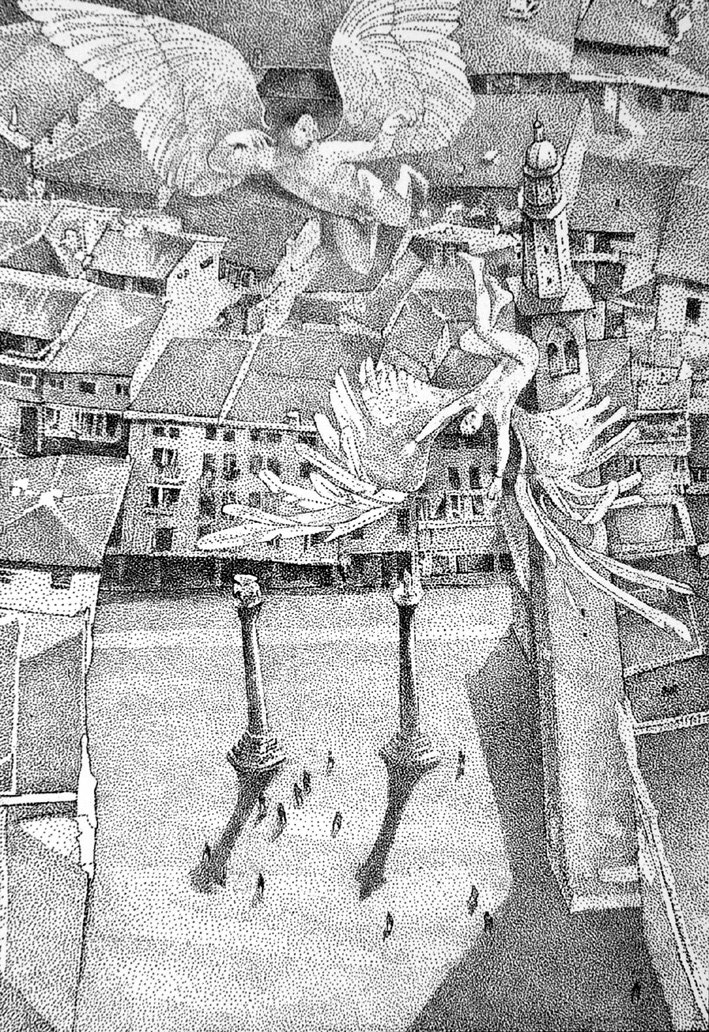 8°; pp. 30 su carta vergata, con 4 illustraz. dell'artista f.testo; seguono sciolte, in apposita cartellina, le 4 litografie originali num. e firmate a matita. Brochure edit. illustrata con titoli al piatto, cordone decorativo al dorso. Bella edizione limitata a complessivi 240 esempl. numerati di cui solo i primi 60 (come il presente) con le litografie originali; firme dell'autore e dell'artista al colophon.<BR>(vedi riproduz.)