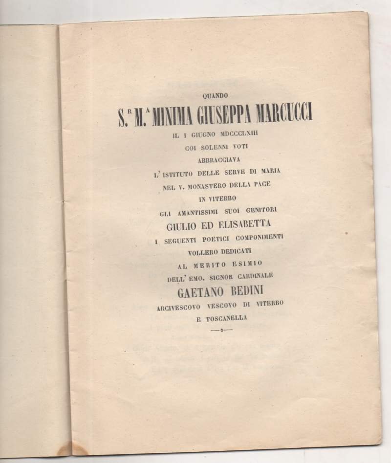 QUANDO S.R M.A. MINIMA GIUSEPPA MARCUCCI il I giugno MDCCCLXIII (1863) coi solenni voti abbracciava l'istituto