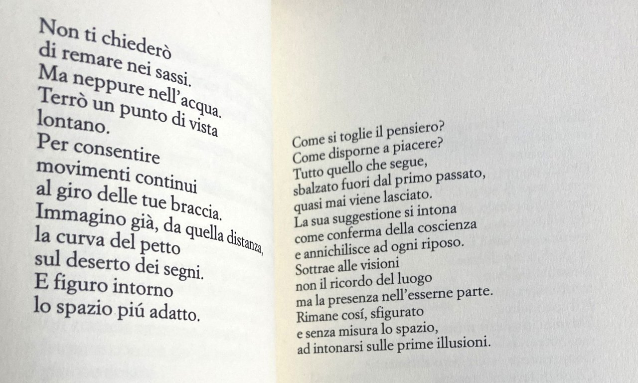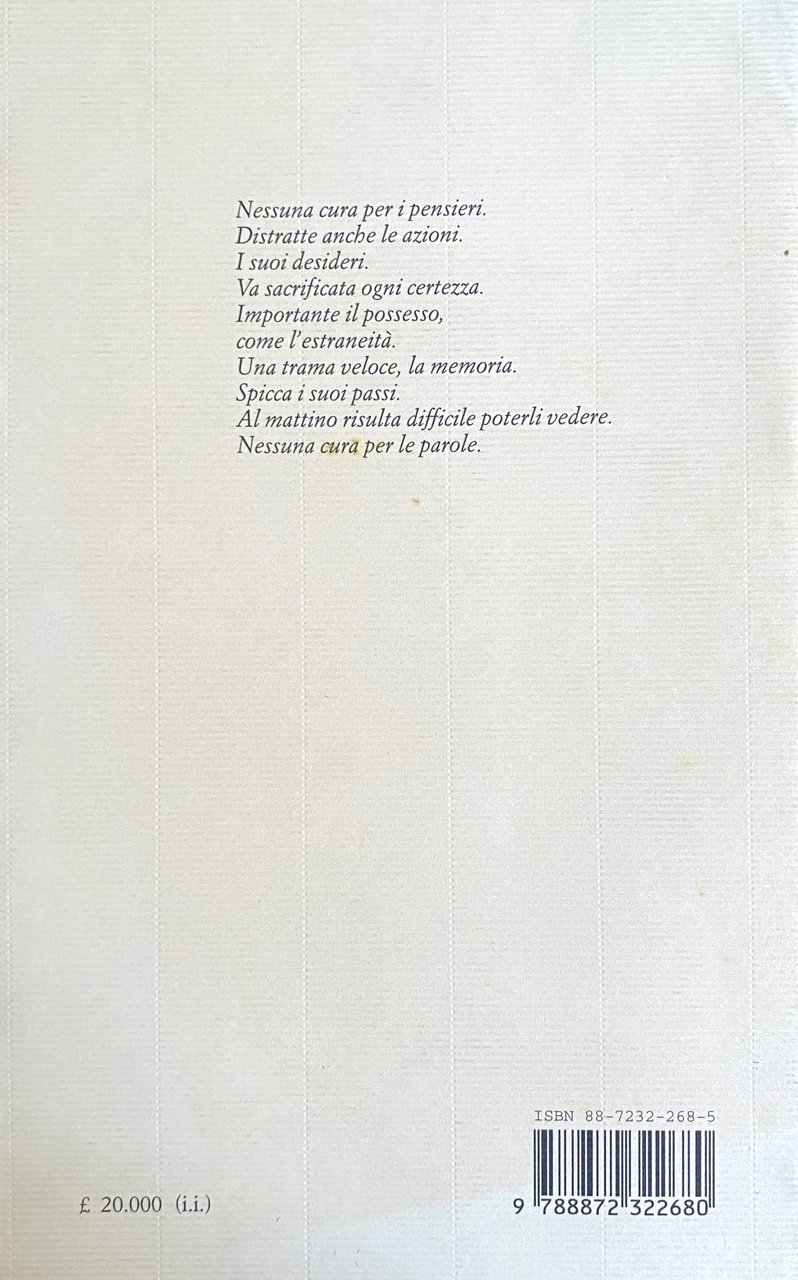 Nessuna cura per i pensieri. Distratte anche le azioni. I suoi desideri. Va sacrificata ogni certezza. Importante il possesso, come l'estraneità. Una trama veloce, la memoria. Spicca i suoi passi. Al mattino risulta difficile poterli vedere. Nessuna cura per le parole.