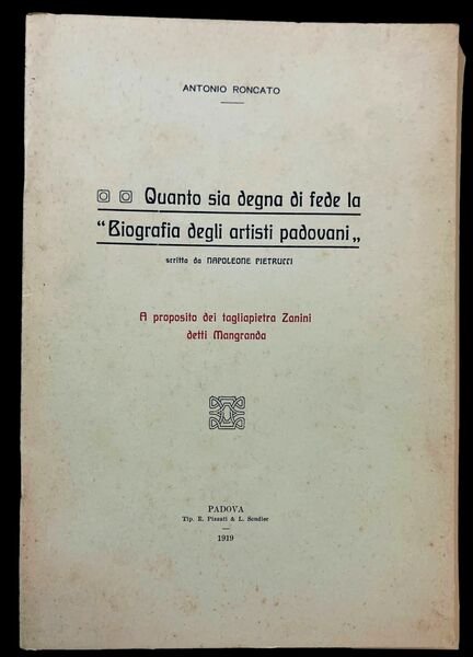 In 4°; 23, (1) pp. Brossura editoriale con titolo e autore impressi in rosso e nero al piatto anteriore. Prima edizione non comune, di questo scritto di commento alla "Biografia degli artisti padovani" di Napoleone Pietrucci ed in particolare ai tagliapietra Zanini detti Mangranda. Ottimo esemplare.