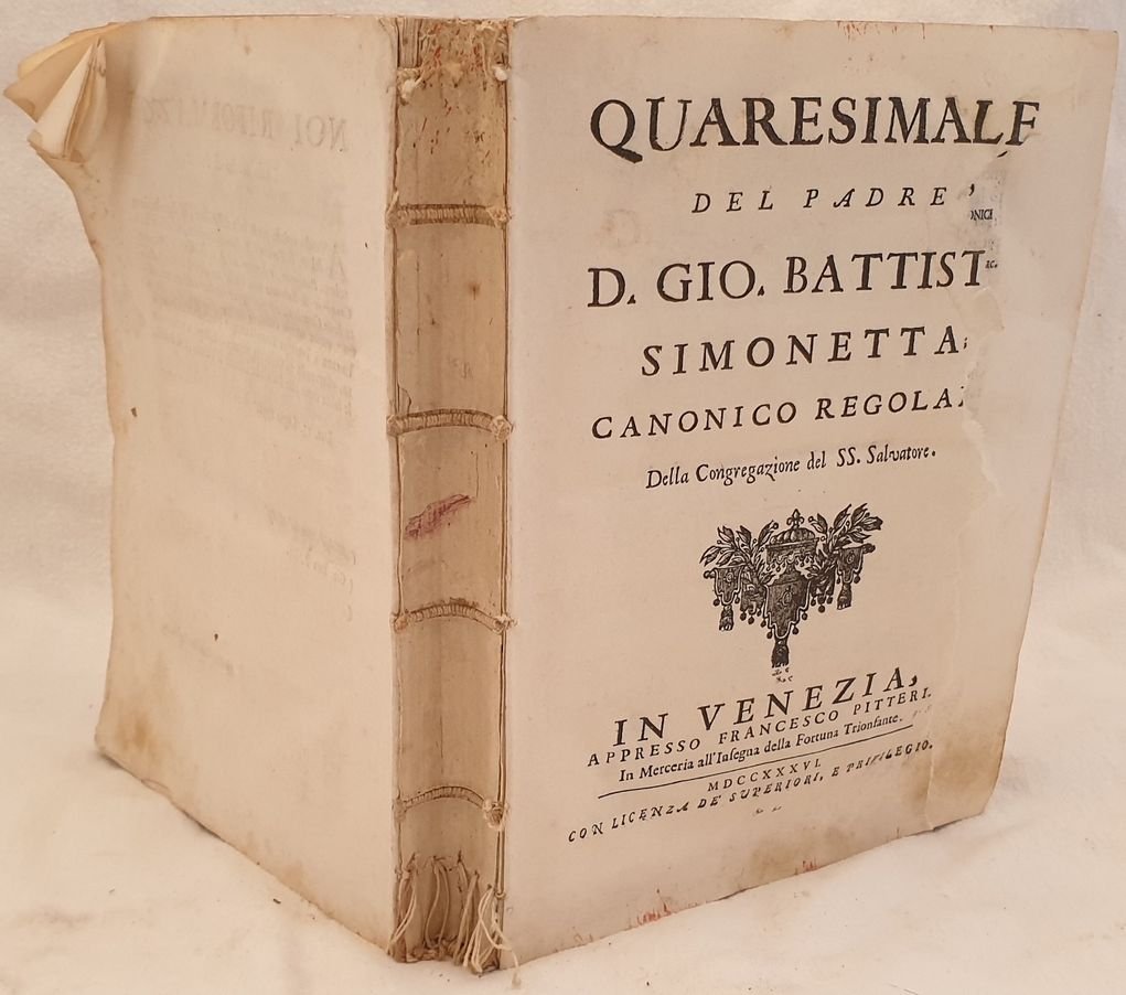 Edizione del 1736 di questo quaresimale del Padre Giovanni Battista Simonetta (1571-1648) della Congregazione del Ss. Salvatore. Tra le prediche presenti: Dignita del corpo umano, Impenitenza, Osservanza dei precetti, Inferno, Peccati, predestinazione, Misericordia Divina, tribolazione ecc. Legato insieme panegirici e sermoni con proprio frontespizio. All'interno: SS. Natale, Anime purganti, Sopra la Immacolata Concezione di MAria, Coronandosi un immagine di MAria Vergine nella città di Foligno, Per l'apparizione dell'Arcangelo Raffaello in Firenze, San Francesco di Paola, Filippo Neri ecc. In buone condizioni ma privo di legatura. Copertina assente. Legatura in buone condizioni. Pagine in ottime condizioni con fioriture. Parte mancante al frontespizio. In 8. Dim. 23,5x18 cm. Pp. XVI+342+(8)+190+(2). Edition of 1736 of this volume of eastern preeches by the Father Giovanni Battista Simonetta (1571-1648) of the Congregazione del Ss. Salvatore. The preeches inside: Dignity of human body, Impenitence, Observance of precepts, Hell, Sins, predestination ecc. Together with the work sermons with itys own title page. inside: SS. Christmas, Imamculate Conception of Mary, An image of Virgin Mary in the city of Foligno, For the apparition of Angel Raffaello in Florence, San Francesco di Paola, Filippo Neri ecc. In good conditions but without cover. Cover lacks. Binding in good conditions. Inside pages are in very good conditions with foxings. Losses in the title page. In 8. Dim. 23,5x18 cm. Pp. XVI+342+(8)+190+(2).