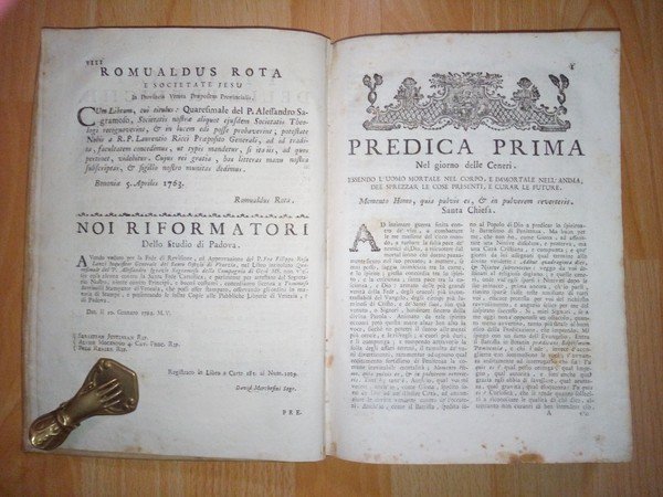 [Fig. Verona-Gesuiti] (cm.26) buona piena pergamena originale, tagli spruzzati.-- pp. VIII, 382 + 1c. di errata. Bel ritratto in rame in antiporta inciso da Antonio Barati. Edizione originale che contiene una notizia biografica di J. Lombardi. L' autore (1690-1760) dotto Gesuita di Verona rivestÏ importanti cariche. Per notizie vedi SOMMERVOGEL e FEDERICI " Elogi Illustri Veronesi " 1818, III 27 . Esemplare bello e fresco. -- DE BECKER-SOMMERVOGEL VII 374; BEZIT I 719 per l' incisore.[f28]