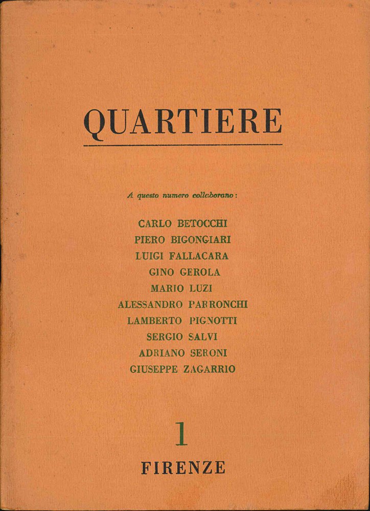 PERIODICOEdizione originale.Collezione composta dai numeri 1, 4-5, 6-7, 8-9. 10, 11, 12, 13-14 (giugno 1958 - dicembre 1962). Lievi segni del tempo alla brossure ma fascicoli in ottimo stato.Rivista fondata a Firenze nel giugno 1958 da Gino Gerola, Lamberto Pignotti, Sergio Salvi e Giuseppe Zagarrio. Attiva fino al 1967, «Quartiere» nacque dalle energie di questo gruppo di poeti fiorentini e si pose grazie a loro come luogo di dibattito e di proposte tese al rinnovamento della poesia stessa in senso sperimentale (in particolare attraverso la contaminazione con altri linguaggi, anche scientifici, come sarà chiaro nel lavoro verbo-visuale dello stesso Pignotti). Determinando il ruolo del trimestrale per la formazione del fiorentino Gruppo 70 - formato, oltre che da Pignotti, da Eugenio Miccini e Luciano Ori - che, in anticipo sul quasi coevo Gruppo 63, si fece portatore di istanze neoavanguardiste in campo letterario, poetico e artistico.