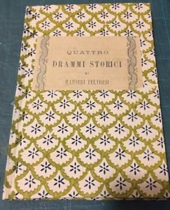 [VT]Rccolta di 4 drammi che raccontano le gesta dei 4 illustri feltresi. Legatura rifatta con parte del piatto ant. applicato al piatto e piatto post. conservato all'interno , piccola mancanza al margine sup. del frontespizio, per il resto buono. Pagg. 176, mis. 180x110