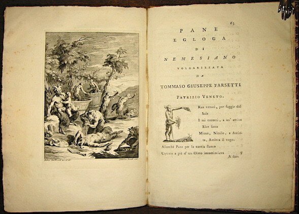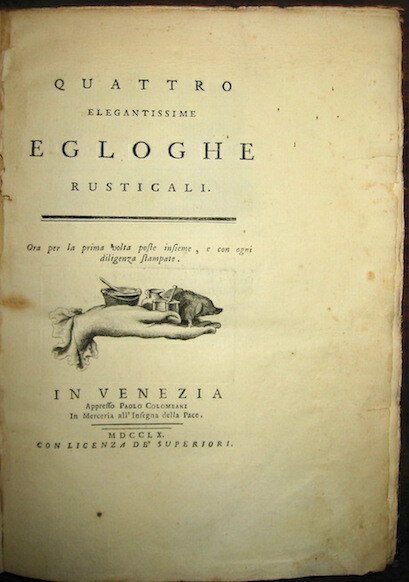 4to (cm. 23,5), 70 pp. Graziosa vignetta al frontespizio, 4 tavv. incise su rame f.t. Capilettera figurati n.t. Legatura ‘800 in mz. pelle con fili e titoli impressi in oro al ds. Ex libris al contropiatto anteriore. Esemplare in barbe in ottimo stato di conservazione. Raffinato libro figurato del ‘700 veneziano con tavole incise da A. Baratti su disegni di A. Novelli e F. Bartolozzi. Interessante anche per le raccolte di gastronomia in quanto alle pp. 26-28 contiene la descrizione in versi del modo di preparare il pesto; inoltre la quarta egloga ha per argomento il vino, e anche la relativa tavola è di carattere bacchico. In Morazzoni (251) sono riprodotte la seconda e la terza tavola; in Gasparrini Leporace (Il libro illustrato nel ‘700 a Venezia) al n. 62 è riprodotta la quarta tavola; Pirani (Libro illustrato italiano) riproduce la quarta tavola.