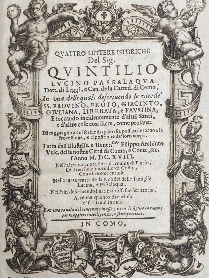 <span style="font-style: normal;">In-4° (cm. 21,4), legatura in piena pelle posteriore con titolo in oro al dorso e piatti inquadrati da cornice floreale sempre in oro; pp. [32] 466 [30] in ottimo stato con 1 tavola araldica fuori testo (stemma della famiglia della dedicataria Lelia Porro) e 20 gradevolissime tavole illustrative segnate in paginazione (ma sempre fuori testo) incise da Giovanni Pietro Bianchi; bel frontespizio inciso in rame nel testo, carta E4 doppia, strappo marginale riparato a una sola carta dell'introduzione che riporta sonetti e madrigali, lievi bruniture e sporadiche fioriture. Edizione originale assai rara, con ricco apparato iconografico, delle </span><i>Quattro lettere</i> che illustrano molteplici storie della città di Como. È miniera d'informazioni locali e dettagli di varie vicende come la processione del vescovo Filippo Archinto in occasione della traslazione delle reliquie dei santi locali in San Pietro in Atrio, o la tremenda frana di Piuro (1618), e ancora l'incendio di Collio nel Bresciano (1619); suscita curiosità anche per la descrizione del meraviglioso stipo Passalacqua, mobile oggi conservato al Castello Sforzesco. Ottimo esemplare. (SH4)