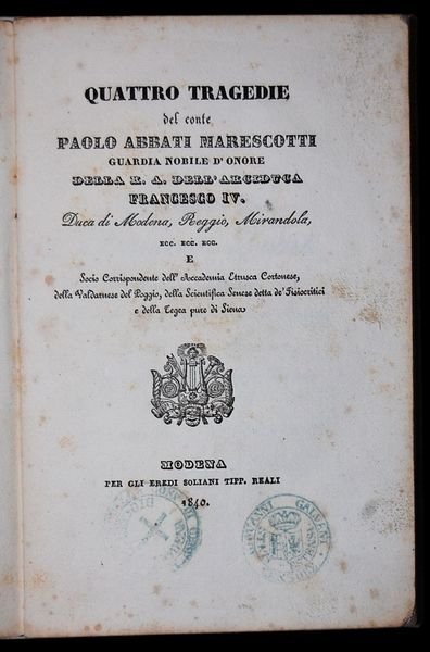 Quattro tragedie del conte Paolo Abbati Marescotti, Guardia d'Onore della R. A. dell'Arciduca Francesco IV. Duca di Modena, Reggio, Mirandola, ecc. ecc. ecc. e Socio Corrispondente dell'Accademia Etrusca Cortonese, della Valdarnese del Poggio, della