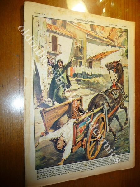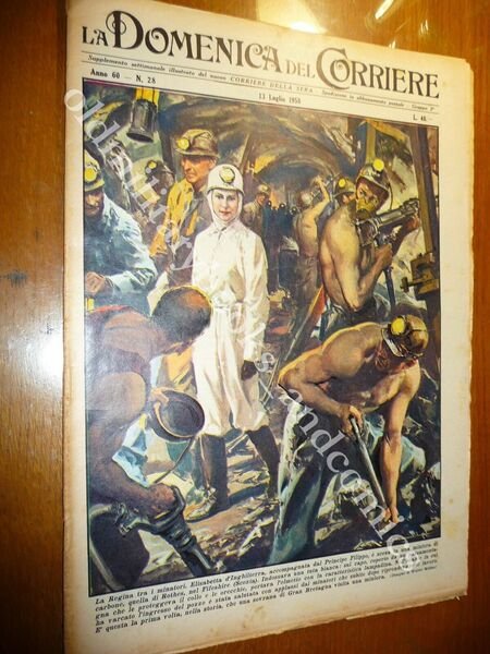 DESCRIZIONE: Domenica del Corriere, Anno 60 n. 28 (13 luglio 1958) COPERTINA: La regina Elisabetta II insieme al Principe Filippo scende nella miniera di Rothes nel Fifeshire (Scozia). RETRO: Come la cavallina storna. Giulio CRACOLICI ucciso da una fucilata, mentre da Tommaso Natale si recava a Cardillo vicino Palermo.La cavallina continua il tragitto fino alla casa della mamma del CRACOLICI. La Domenica del Corriere è stato un popolare settimanale italiano fondato a Milano nel 1899 e chiuso nel 1989. Apparve per la prima volta nelle edicole l'8 gennaio 1899 come supplemento illustrato del Corriere della Sera. Stampata in grande formato (sul modello del domenicale La Tribuna illustrata), aveva 12 pagine e veniva distribuita gratis agli abbonati del Corriere, oppure si poteva acquistare in edicola per 10 centesimi. La prima e ultima di copertina erano sempre disegnate. Il Corriere si avvaleva di un giovane disegnatore, Achille Beltrame, allora sconosciuto, a cui veniva affidato in ogni numero il compito di rendere con la sua tavola il fatto più interessante della settimana. Dopo la sua morte nel 1945, fu sostituito da Walter Molino che, come il suo predecessore, firmò memorabili copertine. A differenza dei settimanali dell'epoca, la Domenica del Corriere diede ampio spazio alle fotografie e ai disegni, e questo fu uno dei motivi del suo successo. CONDIZIONI: Ottime, senza azzurrina. PESO / WEIGHT: 100 gr. without package