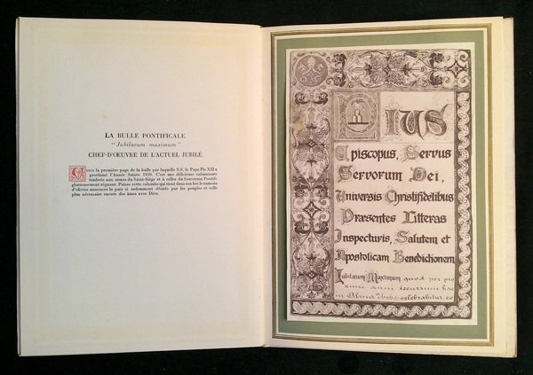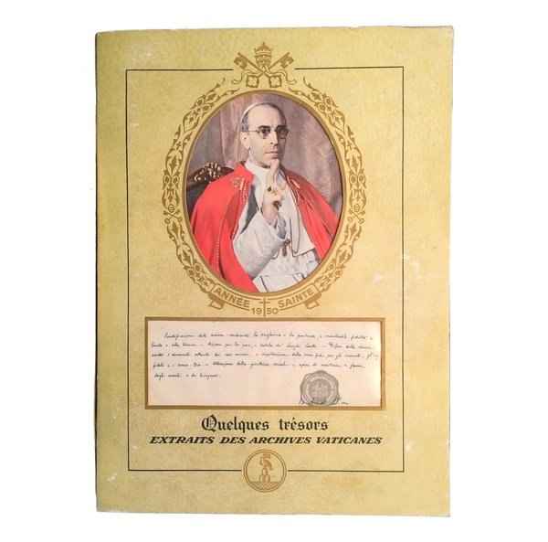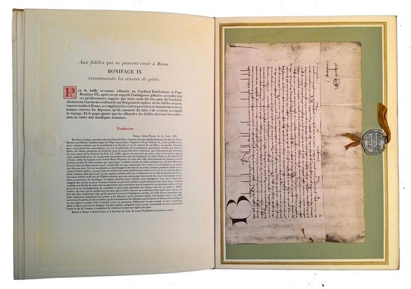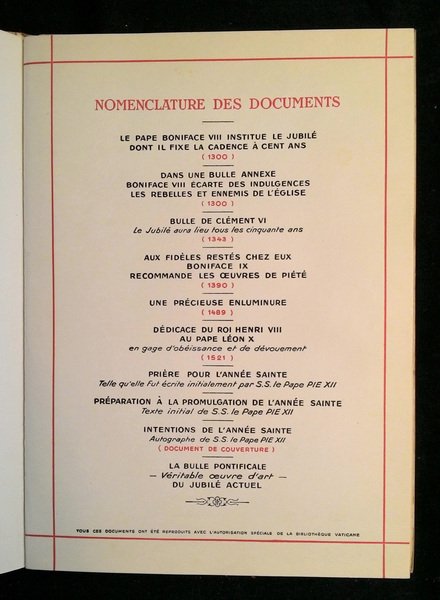 Folio (314x228 mm); leg. editoriale a cartella in cartone illustrato con al piatto anteriore il titolo a caratteri neri e due aperture: una prima apertura ovale bordata a decoro dorato e insegne papali e scritta "Annee Sainte 1950" ed all'interno, sotto pellicola di plastica trasparente, ritratto di Papa Pio XII benedicente; una seconda apertura rettangolare, bordata a filetto dorato, con estratto di un documento papale relativo all'Anno Santo sotto pellicola di plastica trasparente; al piatto posteriore medaglione rotondo dorato con San Pietro e San Paolo; pp. 24 non numerate; frontespizio a caratteri rossi e neri con in cima la scritta "Ce que les pe?lerins n'ont pas vu a Rome"; testo in lingua francese. All'interno del volumetto è riportato l'elenco dei 10 documenti in copia, facenti parte dell'opera (Nomenclature des documents): bolla del Papa Bonifacio VIII che fissa la scadenza a 100 anni dei giubilei (1300), indulgenza a firma dello stesso Papa (1300), bolla di Clemente VI che fissa il giubileo ogni 50 anni (1343), documento di Bonifacio IX (1390), preziosa miniatura scelta come modello di perfezione artistica (1489), dedica di Re Enrico VIII a Papa Leone X (1521), preghiera in bozza per l'Anno santo scritta e corretta dallo stesso Papa Pio XII, preparazione in bozza alla promulgazione dell'Anno Santo, intenzioni dell'Anno Santo (in copertina al piatto), bolla pontificia del Giubileo; ogni documento in copia è incollato su una pagina con fondo verde e bordatura dorata. Prima edizione speciale a tiratura limitata, esemplare numerato (n. 624 di 2000), per l'Anno Santo del 1950 di questa raccolta di copie di documenti importanti nella storia del Papato. -- At head of title: Ce que les pe?lerins n'ont pas vu a Rome. Initials in red. Col. port. of Pope Pius XII on cover. "Tous ces documents ont e?te? reproduits avec l'autorisation spe?ciale de la Bibliothe?que Vaticane. French text. 9 facsimile reproductions of documents held in the Vatican.(some surface loss on covers). Édition Original limited to 2000 numbered copies, of which this is one of the regular copies and numbered 624. -- Rif.: Non censito su ICCU. OCLC, 11655901. Cond.: Qualche leggera traccia d'uso alla legatura, soprattutto al piatto posteriore; opera in ottime condizioni generali.
