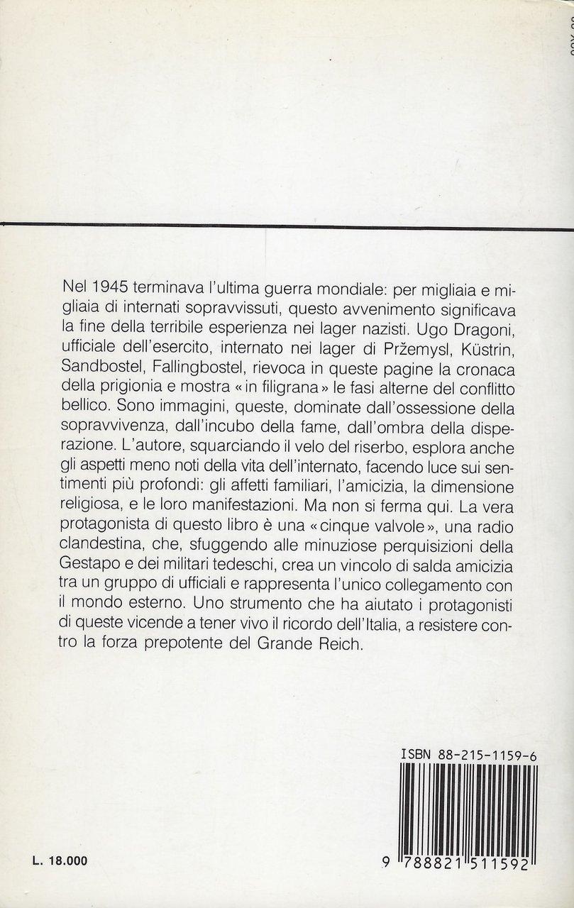 L'autore Ugo Dragoni, ufficiale dell'esercito internato nei lager, rievoca in queste pagine la cronaca della prigionia e mostra le fasi alterne del conflitto bellico. Sono immagini, queste, dominate dall'ossessione della sopravvivenza.