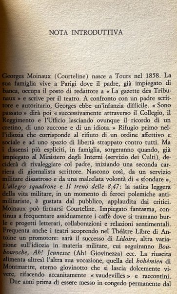 Georges Courteline, (Tours 1858, Parigi 1929) scrittore francese. Esordì con una raccolta di bozzetti caricaturali, che colgono con umore sapido e pungente i tratti caratteristici della vita di caserma (Le allegrie dello squadrone, Les gaietés de l'escadron, 1886). Larga notorietà gli assicurò il romanzo Quelli dalle mezze maniche (Messieurs les ronds-decuir, 1893), ambientato negli squallidi ambienti burocratici ministeriali. Tentò con successo anche il teatro (Boubouroche, 1893), trasportandovi la sua vena di amara comicità e le sue doti di ironico cantore di un'umanità sbiadita e mediocre. Tra le altre sue commedie spiccano: Un cliente serio (Un client sérieux, 1898) e Le marionette della vita (Les marionettes de la vie, 1901).
