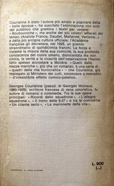 Soggetti: Narrativa, Letteratura francese, Umorismo, Romanzi umoristici, Parigi, Belle époque, Académie Français, Boulevard Saint-Germain, Grand Guignol, Sarcasmo, Vita di ufficio, Burocrazia statale, Burocrati, Ministero della cultura, Impiegati statali, Comicità, Fantocci, Marionette, Commedie, Aforismi, Boubouroche, Teatro, Théâtre Libre, Assurdo, Dialoghi, Personaggi, Caratteri, Funzionari, Rappresentanti, Classi sociali, Quadri, Colletti bianchi, Le train de 8h47, Il treno delle 8.47, I mezzemaniche, I travet, Battute, Mezze maniche, Lavoro, Parodie, Prese in giro, Impiegati pubblici, Nullafacenti, Perditempo, Libri Vintage Fuori catalogo, Racconti, Parassitismo, Dipendenti, Colleghi, Relazioni, Uffici pubblici, Pensionamenti, Licenziamenti, Aumenti retributivi, Avanzamenti di carriera, Stipendio modesto, Legion d’Onore, Pratiche, Documenti, Tragedia, Capufficio, Zelo, Banalità, Ironia, Disciplina, Gerarchie, Potere, Formalismo, Intolleranza, Disagio, Farsa, Amministrazione, Amministrativi, Cosa pubblica, Fannulloni, Assenteisti, Assenteismo, Autocritica, Riti, Rituali, Biografie, Critica, Giudizi, Bibliografia, Cronologia, The Bureaucrats: Scenes from French Official Life, Bureau, Dons et Legs, Caste, Donazioni, Lasciti, Directeur, Direction, Hourmerie, Sens et paradoxes de l'emploi public au XXIe siècle, Vieux chastes, Employé, Fiction, French literature, Humor novels, Paris, Sarcasm, Office life, State bureaucracy, Bureaucrats, Ministry of culture, Civil servants, Comedy, Puppets, Marionettes, Comedies, Aphorisms, Theater, Absurd, Dialogues, Characters, Characters, Officials, Representatives, Social classes, Managers, White-collar workers, The 8.47am train, The mezzemaniche, The travet, Jokes, Half sleeves, Work, Parodies, Teasing, Public employees, Wasting time, Out of print books, Tales, Parasitism, Employees, Colleagues, Relations, Public Offices, Retirements, Layoffs, Salary Increases, Career Advances, Modest Salary, Legion of Honor, Practices, Documents, Tragedy, Office Manager, Zeal, Trivia, Irony, Discipline, Hierarchies, Power, Formalism, Intolerance, Discomfort, Farce, Administration, Administrative, Loafer, Absenteeism, Absenteeism, Self-criticism, Rites, Rituals, Biographies, Criticism, Judgments, Bibliography, Castes, Donations, Legacies