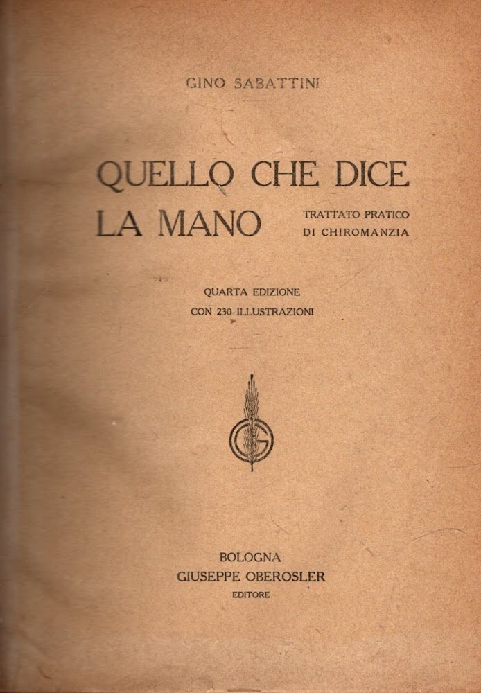 QUELLO CHE DICE LA MANO. TRATTATO PRATICO DI CHIROMANZIA ** SABATTINI GINO ** OBEROSLER S.D. QUARTA ED. CON 230 ILLUSTRAZIONI. PP. 189. CM 22 X 16.5. RILEGATO IN MEZZA PELLE. BUONISSIME CONDIZIONI