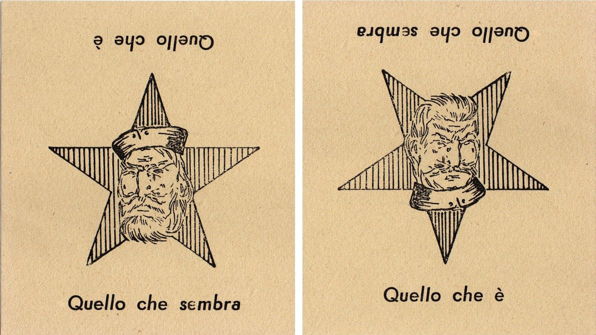 Volantino di propaganda contro il Fronte Democratico Popolare (FDP). In occasione delle elezioni politiche del 18 aprile 1948 le sinistre costituirono l'FDP, formato dal PCI di Palmiro Togliatti, dal PSI di Pietro Nenni e da altri partiti minori. Il simbolo della coalizione rappresentava il volto di Garibladi sovraimpresso a una stella a cinque punte. In questo cartoncino, per alludere alla "minaccia" comunista, gli oppositori dell'FDP sostituirono al volto capovolto di Garibaldi quello di Stalin. L'FDP si sciolse dopo le elezioni a causa degli scarsi risultati raccolti.