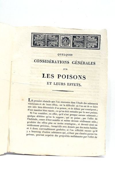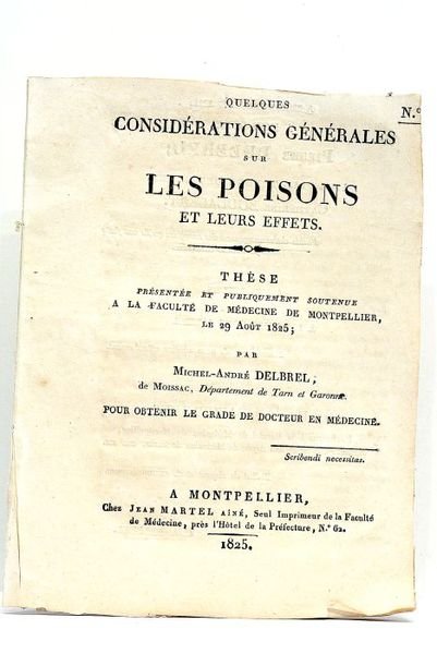 in-4. 23pp. Broché. Marges irrégulières. Brochés en partie déreliés. Etude de toxicologie contenant notamment des remarques sur l'opium, l'arsenic, l'acide sulfurique, la ciguë, etc.