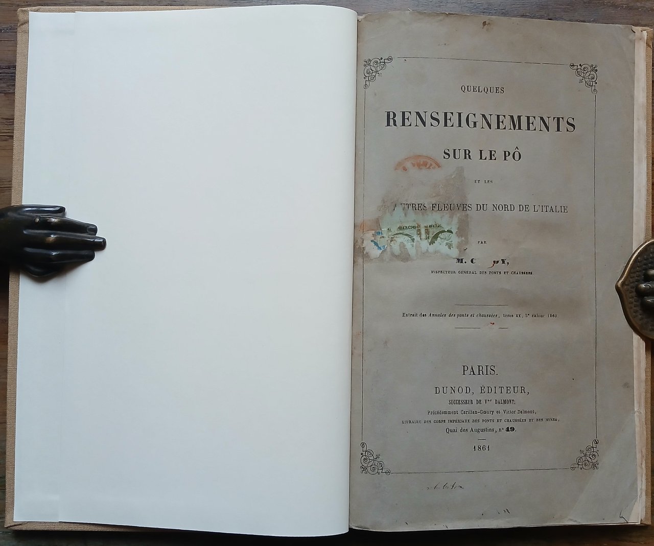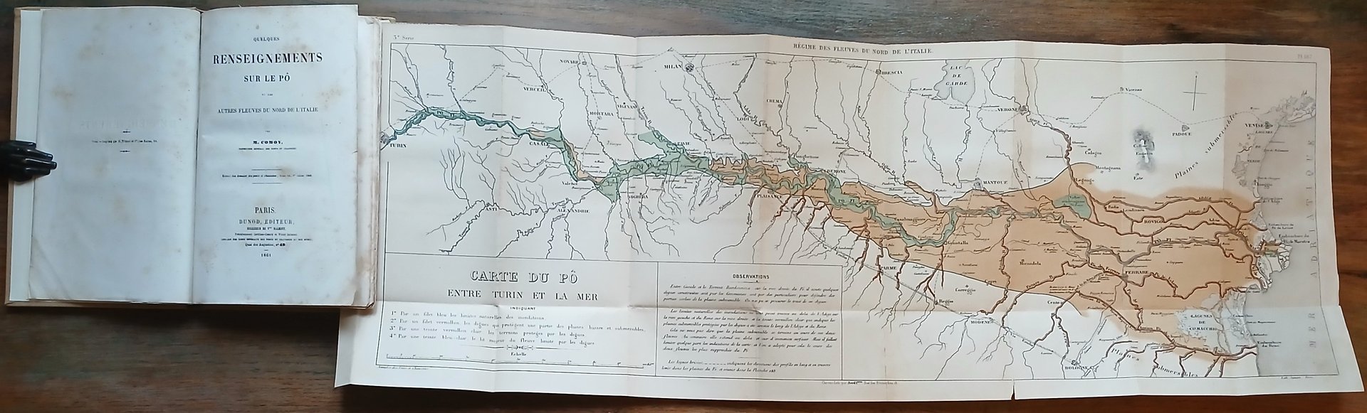 (Fiume Po - Idrografia - Fiumi Italia settentrionale; Ingegneria idraulica) In 8°, legatura moderna in piena tela ocra chiaro, conservata all'interno la prima di copertina della brossura originale, di cui una riproduzione è stata applicata al piatto anteriore, pp, (4),48 con 4 carte più volte ripiegate fuori testo (una cromolitografia con la "Carte du Po entre Turin et la mer" e tre profili altimetrici incisi in acciaio). "Extrait das Annales des ponts et chaussées", tome XX, cahier 1860. Alcune tracce di ossidazione alle pagine del testo, peraltro buono stato di conservazione.