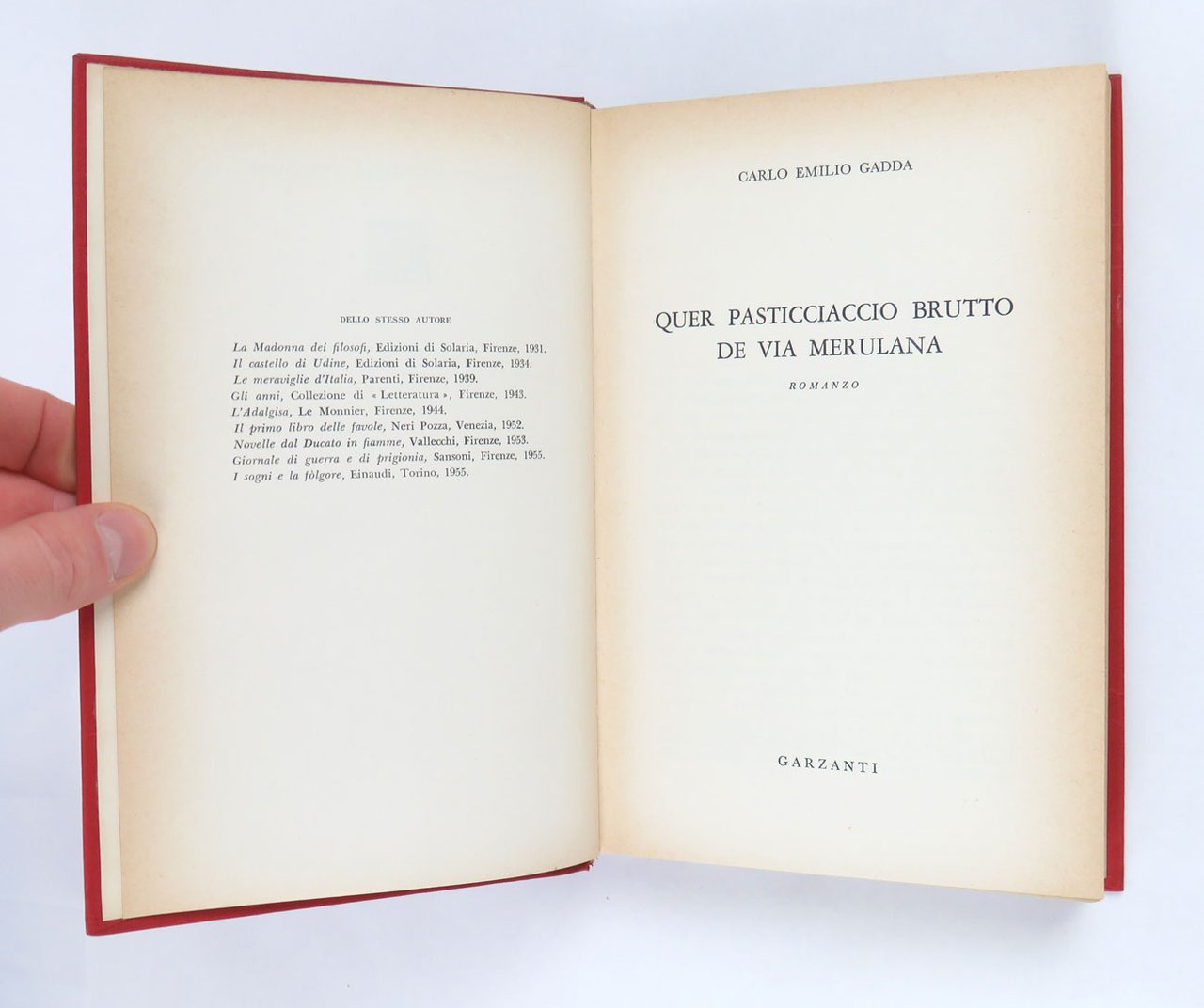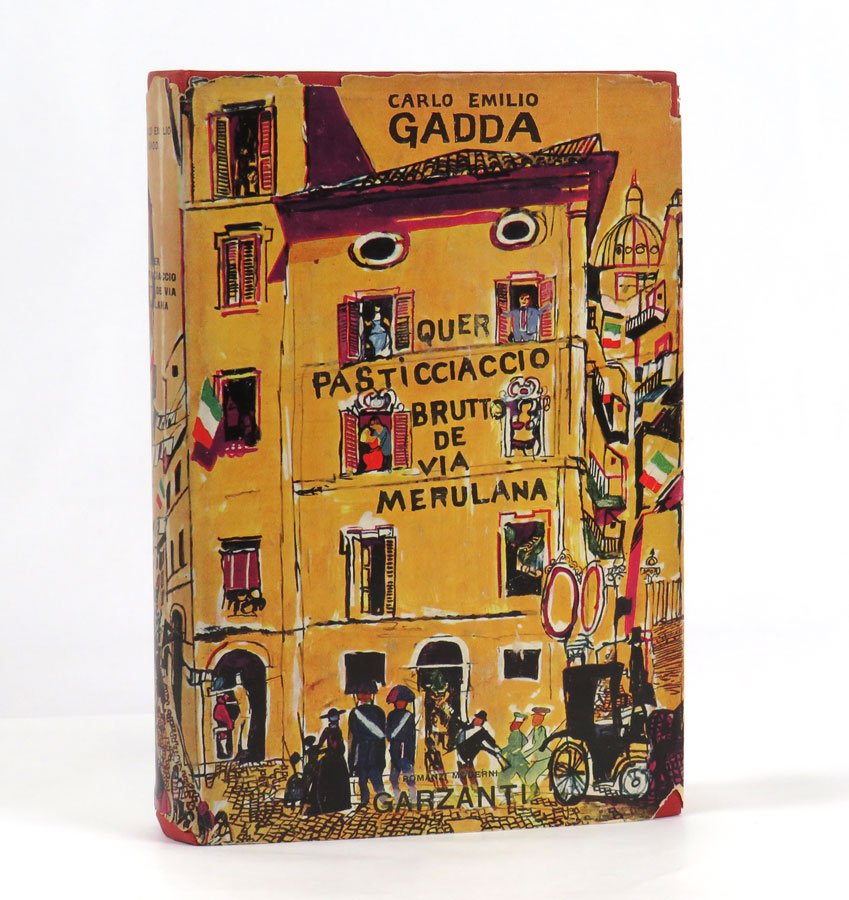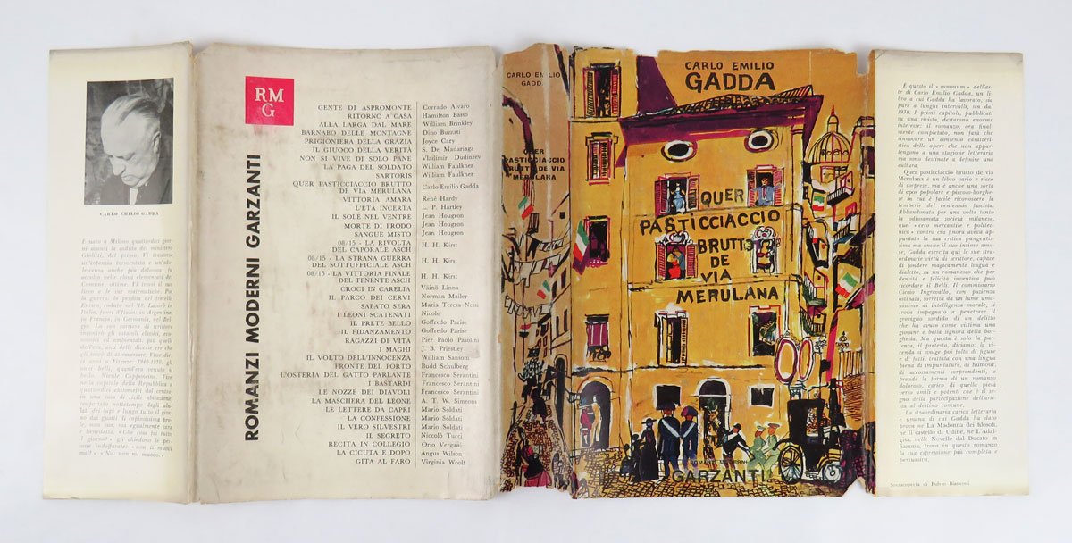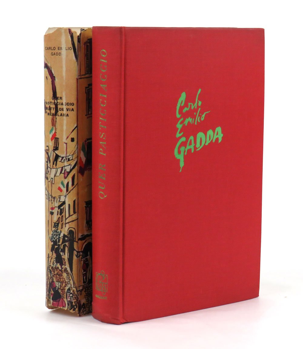LIBROEdizione originale.Ottimo esemplare, con la sovracoperta complessivamente ottima (minuto restauro in testa al dorso e al piatto anteriore, per il resto non toccata).Il «Pasticciaccio» nacque nel 1945 dall’idea di Alessandro Bonsanti per una serie di racconti gialli gaddiani da pubblicarsi su «Letteratura» e quindi in libro per le stesse edizioni. Gadda prese spunto da un cruento episodio di nera romana: in realtà il primo racconto si dilatò in cinque puntate uscite sulla rivista nel corso del 1946 (nn. 26–29 e 31). Ma il percorso verso il libro era ancora lungo e accidentato e solo la costanza di un altro editore, Livio Garzanti, otterrà che il libro venga alla luce, dopo oltre dieci anni, nella versione che oggi conosciamo: modificata, aumentata e profondamente rivista anche nel linguaggio (grazie al paziente lavoro di editing del romanesco a cura di Mario Dall’Arco): «Fra l’aprile e il giugno [1958], sotto gli occhi attoniti di Garzanti, più che mai determinato a concorrere (entro il 30 giugno) al premio Marzotto, si decide infatti, a prezzo di un’indicibile fatica, il definitivo assetto del romanzo […]. L’ultimo inserto, annunciato il 14 giugno, deve essere giunto manoscritto in casa editrice nei primi giorni di luglio, sicché è miracoloso che — con il finito di stampare del 22 giugno (certo per consentire la partecipazione al Marzotto), un titolo frutto di lunghe trattative e la “sopracoperta color zabaione, piuttosto bella, del pittor Bianconi” [n. d. Gadda] — il 24 luglio il romanzo prenda la via delle librerie» (Pinotti p. 339). Il successo è immediato: la ristampa è di metà settembre e nel gennaio dell’anno seguente si sono già vendute oltre 15.000 copie; si vendono i diritti per le traduzioni e per la versione cinematografica (Germi, Un maledetto imbroglio). Era nato un classico contemporaneo» (Pinotti). Il disegno del «Pasticciaccio» avrebbe previsto un secondo volume o almeno un’edizione ampliata e corredata di un finale vero e proprio, ma lo scrittore non riuscirà mai a condurre a termine l’impresa.Sebastiani, Catalogo Gadda, n. A XIV; Pinotti, Nota al testo dell’ed. Milano: Adelphi, 2018, pp. 309-370