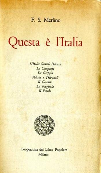 IX, 252 p. ; 24 x 16 cm. Questo libro non si occupa delle manifestazioni esteriori della pretesa grandezza dell'Italia. Si occupa della genesi del nuovo stato unitario, delle sue contraddizioni, della formazione di una borghesia affamata di potere e egoista, del sottogoverno della gestione pubblica e della corruzione della vita politica in un contesto generale di repressione delle istanze popolari e dell'assoluta mancanza di una vera democrazia. È una denuncia implacabile di un testimone oculare e attento come Francesco Merlino, di un sistema politico e di dominio corrotto e autoritario che sfocerà nel militarismo e nel fascismo. Legatura in tela non editoriale, coperta in cartone rigido telato di colore verde con impresso in oro al dorso il titolo dell'opera, si conserva all'interno la copertina flessibile originale. Carta interna ingiallita, timbro di appartenenza nell'occhiello, per il resto libro integro. Codice libreria 8230.