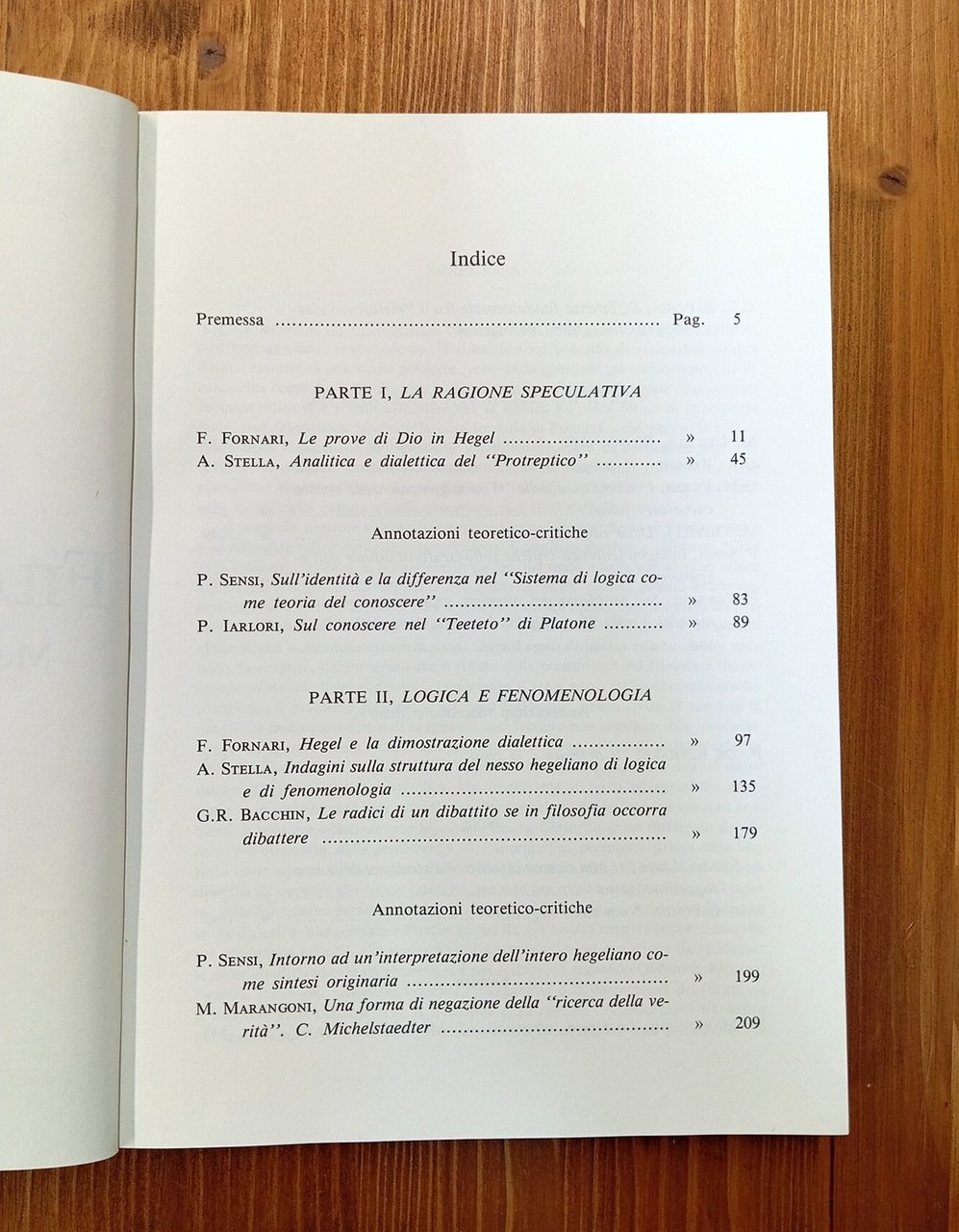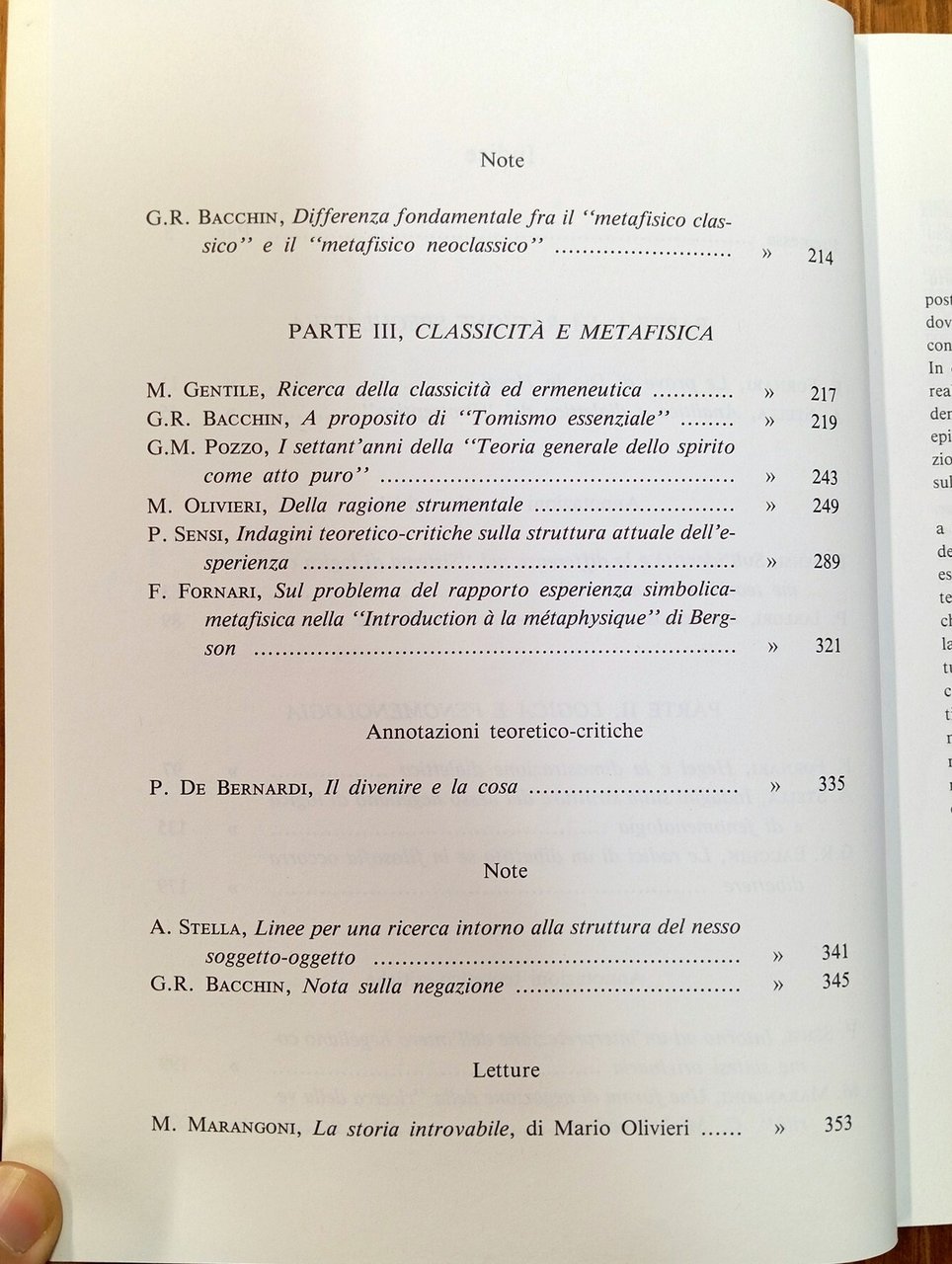 Brossura editoriale di 357 pagine. Indice integrale consultabile nelle nostre immagini. Testi di G.R. Bacchin, P. De Bernardi, F. Fornari, M. Gentile, P. Iarlori, M. Marangoni, M. Olivieri, G.M. Pozzo, P. Sensi, A. Stella. Copia in eccellenti condizioni, probabilmente mai letta; testo di difficile reperibilità -- La questione del rapporto tra il pensiero e la sua storia si intrama ormai da lungo tempo con i problemi fondamentali della filosofia e impone di ripensare i metodi e le procedure che stanno alla base dell'atteggiamento storiografico in filosofia. Nel tentativo di denunciare l'impossibilità storiografica di cogliere in presa diretta i problemi filosofici, già Kant, nei Prolegomeni ad ogni futura metafisica, scrisse: "Vi sono dei dotti che hanno come propria filosofia la storia della filosofia (sia antica che moderna); non sono scritti per loro i presenti Prolegomeni. Essi devono attendere che coloro che si studiano di attingere alle fonti stesse della ragione, abbian conclusa l'opera loro; allora toccherà ad essi di dare al mondo notizia dell'accaduto". Dal canto suo, Husserl vide nella storia della filosofia un modo di nascondere il problema dell'origine razionale della filosofia stessa. Un mascheramento questo destinato a produrre quella crisi del sapere che ancora oggi ci coinvolge totalmente e che sfocia da una parte nelle rigide posizioni dell'obiettivismo scientifico e dall'altra nell'elaborazione di 'Weltanschauungen', cioè di quel relativismo storicista che sta alla base delle cosiddette scienze umane. Stando così le cose, e volendo ancora dare un senso alla parola 'filosofia', si tratterà allora di disfare ciò che la tradizione storiografica è andata costruendo, per trovare non contro, ma oltre di essa la radicalità della questione filosofica.