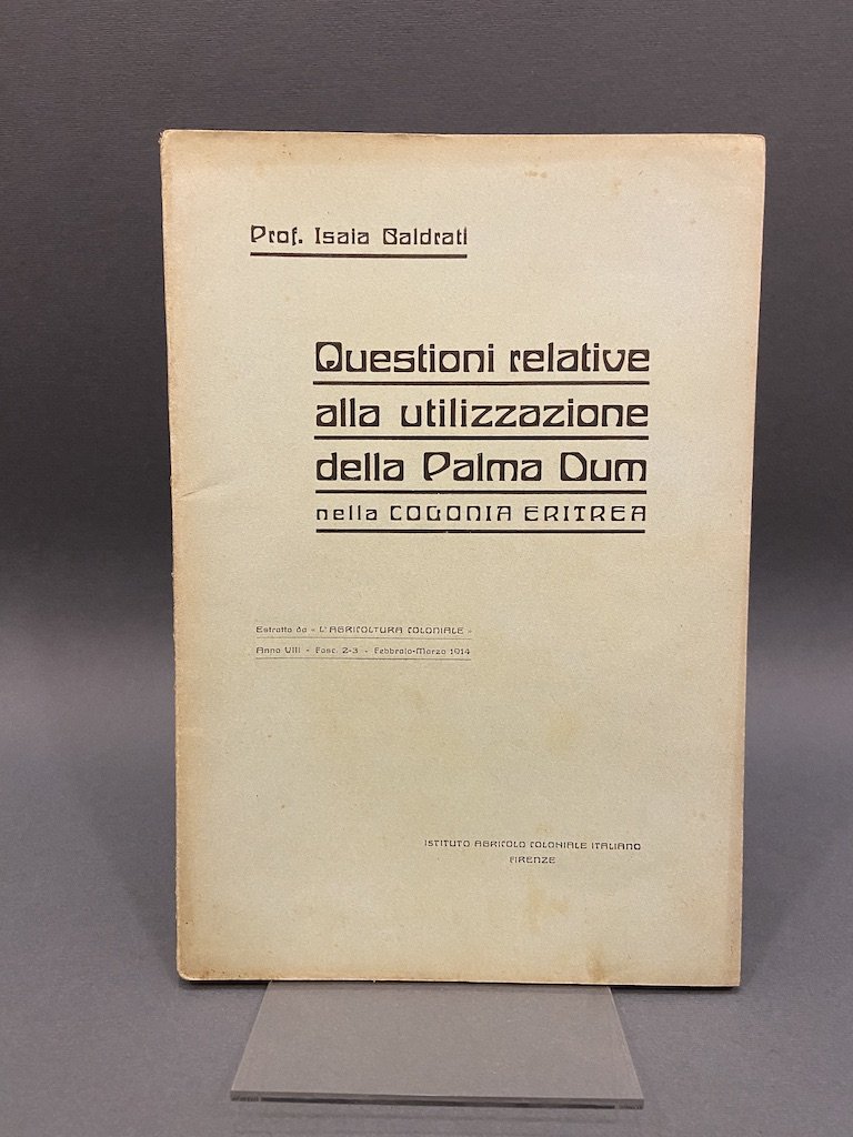 Estratto in brossura editoriale a stampa, cm 24x16.5, pp 44. Sulla prima pagina una firma di proprietà, alcune sottolienature a matita rossa e lapis. Isaia Baldrati, botanico e agronomo, fu direttore della quale Baldrati fu primo direttore della Cattedra Ambulante di Agricoltura di Ascoli Piceno, poi a Ravenna, all'Istituto Agricolo Coloniale di Firenze; in Eritrea fu nelle amministrazioni di Ferdinando Martini e Giusepep Salvago Raggi, effettuò ricerche in campo botanico e agronomico e contribui all'organizzazione delle esposizioni coloniali di Martini.