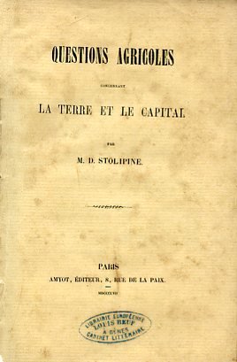 In-8° (213x140mm), pp. 27, brossura originale a stampa (dorso rifatto). Timbri del tempo della Librairie Européenne Louis Beuf di Ginevra. Fioriture, ma buon esemplare. Edizione originale, molto rara, di questo libello sull'industria agricola e il capitale scritto da Dmitrii Arkad'evich Stolypin (1818-1893), zio di Pëtr Arkad'evic Stolypin (Dresda, 1862-Kiev, 1911), il celebre uomo politico russo che fu Ministro degli interni e Primo ministro dell'Impero Russo dal giugno 1906 al 18 settembre 1911 sotto Nicola II e che trovò la morte assassinato da Dmitrij Bogrov. Le riforme agrarie promosse da Stolypin nel corso del suo incarico ministeriale (introduzione della proprietà privata tra i contadini con conseguente formazione di un ceto di contadini ricchi, trasformazione delle proprietà a economia servile in aziende di tipo capitalistico) hanno il loro lontano prodromo in questo pamphlet, volto a proporre una nuova forma di distribuzione della proprietà terriera. '.Des différents modes d'appropriation de la terre, la propriété individuelle semble être la seule qui puisse donner un grand essor à la prosperité nationale, et ainsi on ne peur qu'approuver le partage des communaux demandé par les intéressés, et le passage des terres de l'État dans le domaine de l'industrie publique'. Manca ad Einaudi (che n. 5485, cita solo, di questo autore, la memoria 'Dello sminuzzamento delle terre in Francia', traduzione, nella 'Biblioteca dell'Economista' del 1860, dell'articolo 'Du morcellement des terres') e ai repertori economici consultati.