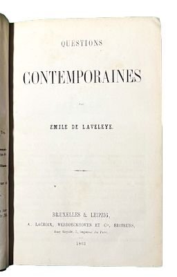In 8°; (4), XII, 6-351, (3) pp. Bella legatura coeva in mezza-pelle con dorso a 4 nervi. Titolo, autore, filetti e ricchi fregi in oro e a secco e al dorso. Piatti foderati in carta marmorizzata rossa al piatto anteriore. Antica pecetta di venditore di libri di Rio de Janeiro allinterno del piatto anteriore. Piatti interni foderati dicarta marmorizzata. Prima non comune edizione di questa raccolta di articoli del celeberrimo economista e saggista belga Émile Louis Victor de Laveleye (Bruges, 5 aprile 1822 Liegi, 3 gennaio 1892). Fra gli articoli contenuti nellopera: Le Communisme; La justice dans la revolution et dans lEglise par M. P.-J. Proudhon; Les coulisses dun grand regne ecc. Émile Louis Victor de Laveleye è stato un economista e saggista belga di grande rilevanza nel panorama intellettuale del XIX secolo. Dopo aver completato gli studi in giurisprudenza e scienze sociali, de Laveleye si distinse per il suo impegno nella diffusione delle idee economiche liberali e nel contributo al dibattito sociale della sua epoca. Insegnante di economia politica allUniversità di Liegi, divenne un attivo promotore del pensiero economico liberale, enfatizzando limportanza del liberomercato e la necessità di riforme sociali. La sua abilità nellanalizzare le dinamiche economiche e sociali lo rese un punto di riferimento per studiosi e politici. Una delle sue opere più importanti è La Propriété et le Droit de Propriété, in cui afferma il valore della proprietà privata come fondamento della libertà individuale e della prosperità economica. De Laveleye affrontò anche temi di cooperazione e mutualismo, sostenendo lidea che il progresso economico dovesse essere accompagnato da un miglioramento delle condizioni sociali dei lavoratori. Il suo approccio pragmatico e la sua attenzione ai problemi sociali gli permisero di guadagnarsi il rispetto tra i contemporanei. Morì a Liegi il 3 gennaio 1892. La sua eredità vive attraverso le sue opere, che continuano a influenzare il pensiero economico e sociale. De Laveleye è ricordato non solo per i suoi contributi teorici, ma anche per il suo impegno a promuovere una società più giusta e prospera attraverso uneconomia libera e inclusiva.