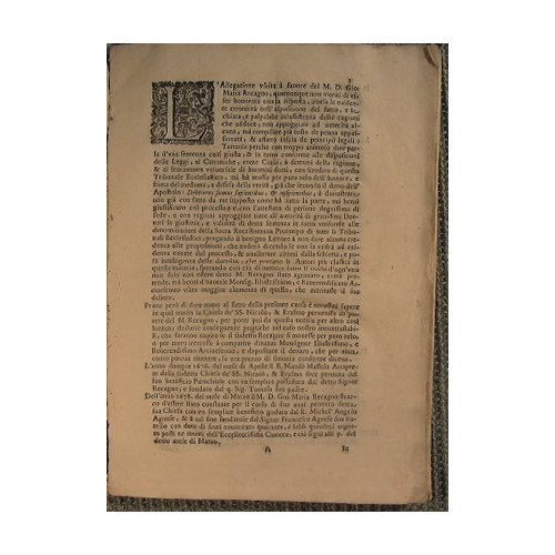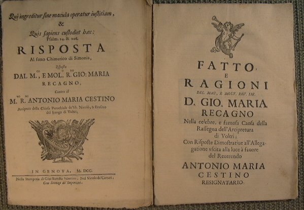 Cestino Arciprete della chiesa Parochiale de SS. Nicolò, & Erasmo del luogo di Voltri - in 4° - pp.42 + 28 - - Due fascicoletti - Marca al frontespizio, capolettera xilografico - Fatto e ragioni del Mag. e molt. Rev. Sig. D. Gio. Maria Recagno nella celebre e famosa caosa della rassegna dell'arcipretura di Voltri; Con risposte dimostratie e allegatione uscita alla luce a favore del reverendo Antonio Maria Cestino Resignatario.