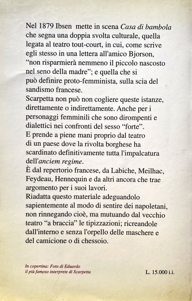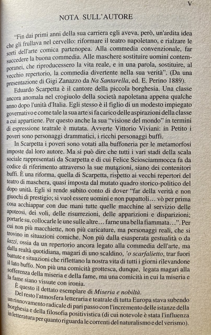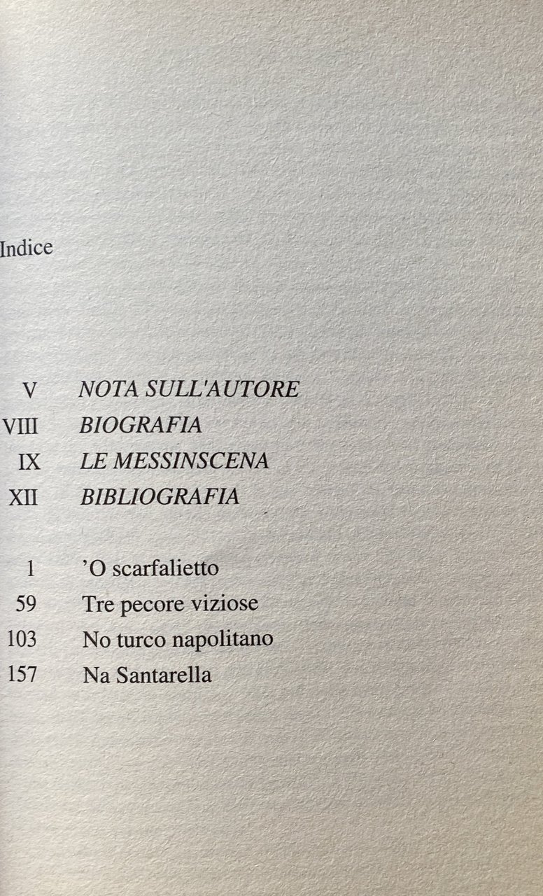 Soggetti: Letteratura teatrale, Teatro, Spettacolo, Commedie, Commedia napoletana, Comicità, Ironia, Testi teatrali, Classici, Libri rari fuori catalogo, Napoletanità, Dialetto napoletano, Opere dialettali, Cinema, Bibliografia Riferimento Collezionismo Messinscena Critica Interpretazione 'O Scarfalietto Tre pecore viziose No turco napoletano Na Santarella Totò Miseria e nobiltà Felice Sciosciammocca Arte comica Cultura partenopea Novecento Ottocento Atti Repertorio Società Donne Satira Classe media Borghesia Riforma Personaggi femminili Vernacolo Ceto medio Vita quotidiana Battute Gag Drammaturgia Edoardo De Filippo Benedetto Croce San Carlino Bellini Roberto Bracco Salvatore Di Giacomo Raffaele De Crescenzo Adelina Magnetti Parodie Figlia di Iorio Gabriele D'Annunzio Sannazaro Cafè Chantant Fiorentini Ajello Russo Vittorio Viviani Rasi Leonelli Compagnie Teatri Storia A. Petito Successo Applausi Pochades francesi Figli Vincenzo Domenico Maria Peppino Titina De Filippo Ernesto Murolo Eduardo Passarelli Pasquale Chiaia Vomero Salone Margherita Mario Martone Sciantose Le Parisien Nutrice Gino Rossetti Mario Mattoli Giorgio Pàstina Tiziana Paladini Saggi Napoli Natale in casa Cupiello Nobilissima Libero Bovio Palcoscenico Pubblico Successi Ferdinando Russo Figlio Gandusio Parisi Frak Carovigna Umorismo Theatrical literature Theater Entertainment Comedies Neapolitan comedy Comedies Irony Theatrical texts Classics Rare books out of print Neapolitanism Dialect works Bibliography Reference Collectibles Staging Criticism Interpretation Poverty and nobility Comic art Culture Twentieth Nineteenth century Acts Repertoire Society Women Satire Middle class Bourgeoisie Reform Female characters Vernacular Daily life Jokes Dramaturgy Parodies Daughter Theater Companies History Success Applause Children Essays Naples Christmas Most Noble Public Stage Successes Son