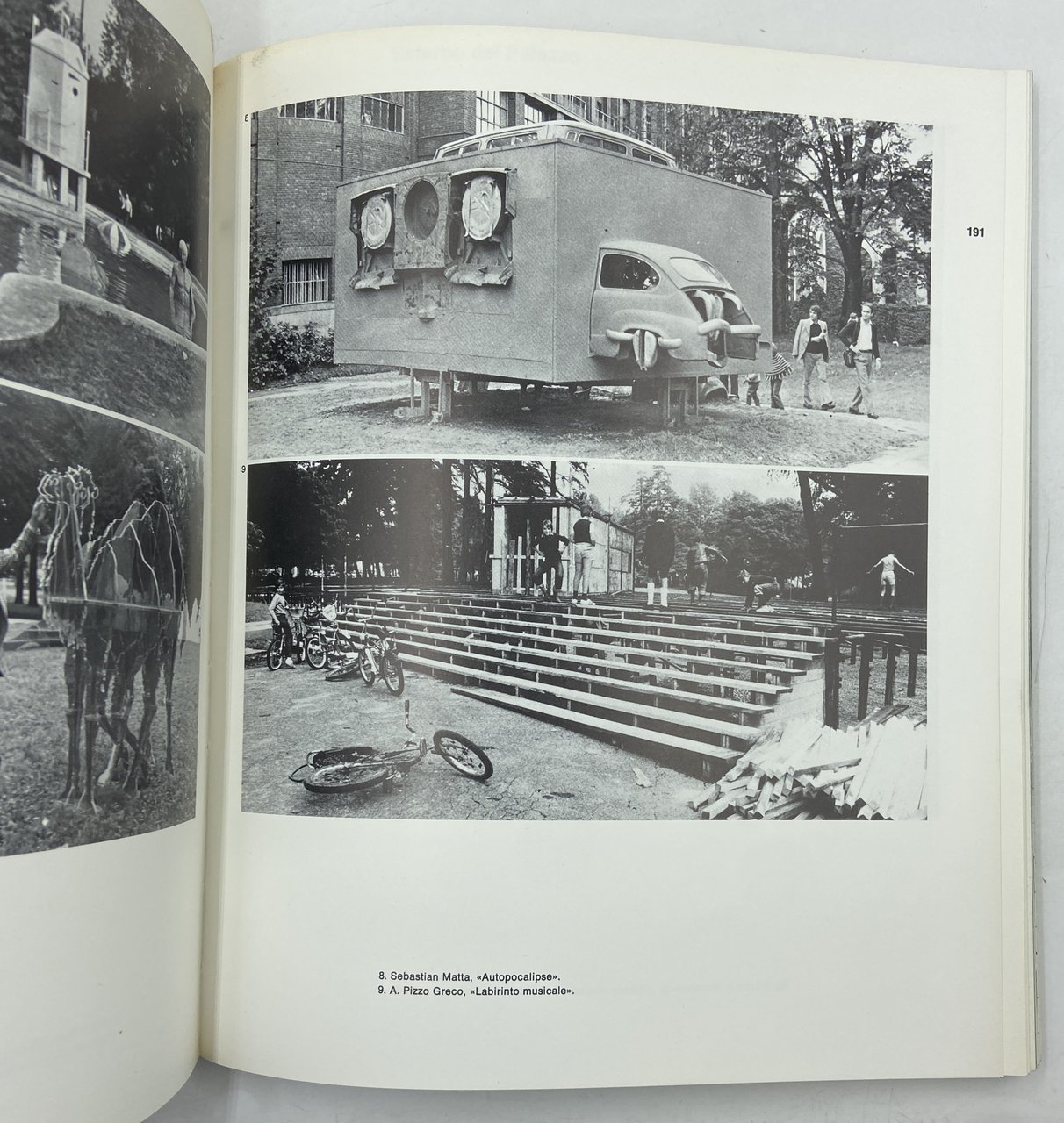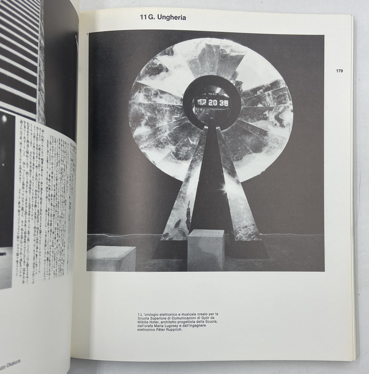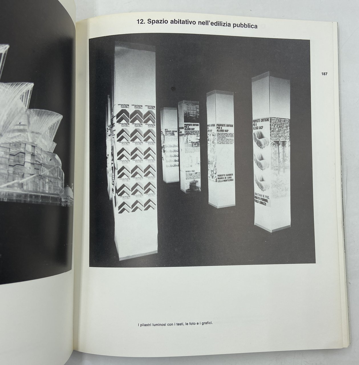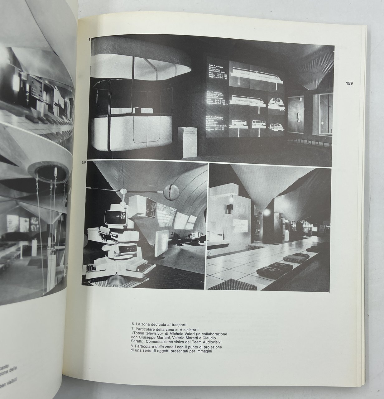 Legatura editoriale illustrata con dorso in tela e piatti cartonati, cm 29x24, pp 217 (73) con numerose illustrazioni in nero. Testi in italiano, francese e inglese. Unito fascicolo spillato di (12) pagine dedicato alla Sezione italiana. Catalogo della quindicesima Triennale milanese, con progetto grafico e copertina di Giulio Confalonieri. I padiglioni sono presentati con piante schematiche e testi dei curatori (segnaliamo per la Mostra internazionale dell’industrial design il testo introduttivo di Ettore Sottsass che la curò con Andrea Branzi); seguono circa 60 pagine di documentazione fotografica dei padiglioni e delle mostre, e circa altrettante di inserzioni aziendali. Unito il fascicolo sulla Sezione italiana della Triennale, Lo spazio vuoto dell’habitat, col testo del curatore Eduardo Vittoria.