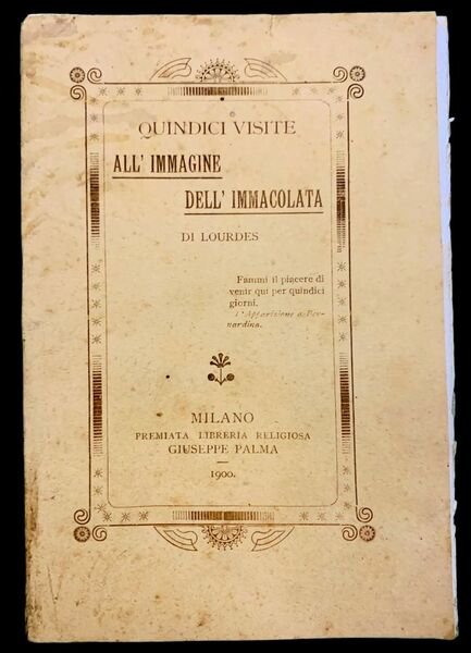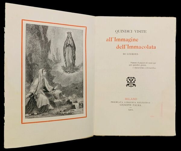 In 12° () 48, (2) pp. e una c. di tvav. in antiporta con un'immagine di una delle apparizioni della Madonna di Lourdes. Brossura editoriale con titolo e stampatore al piatto anteriore, entro cornice xilografica. Esemplare in buone condizioni di conservazione. Rara prima edizione di questo devozionalia dedicato alla figura della celebre Madonna apparsa alla giovane pastorella, Bernadette Soubirous a partire dal 1858. Molto raro, un solo esemplare censito in ICCU. Rif. Bibl.: IT\ICCU\PBE\0086152.