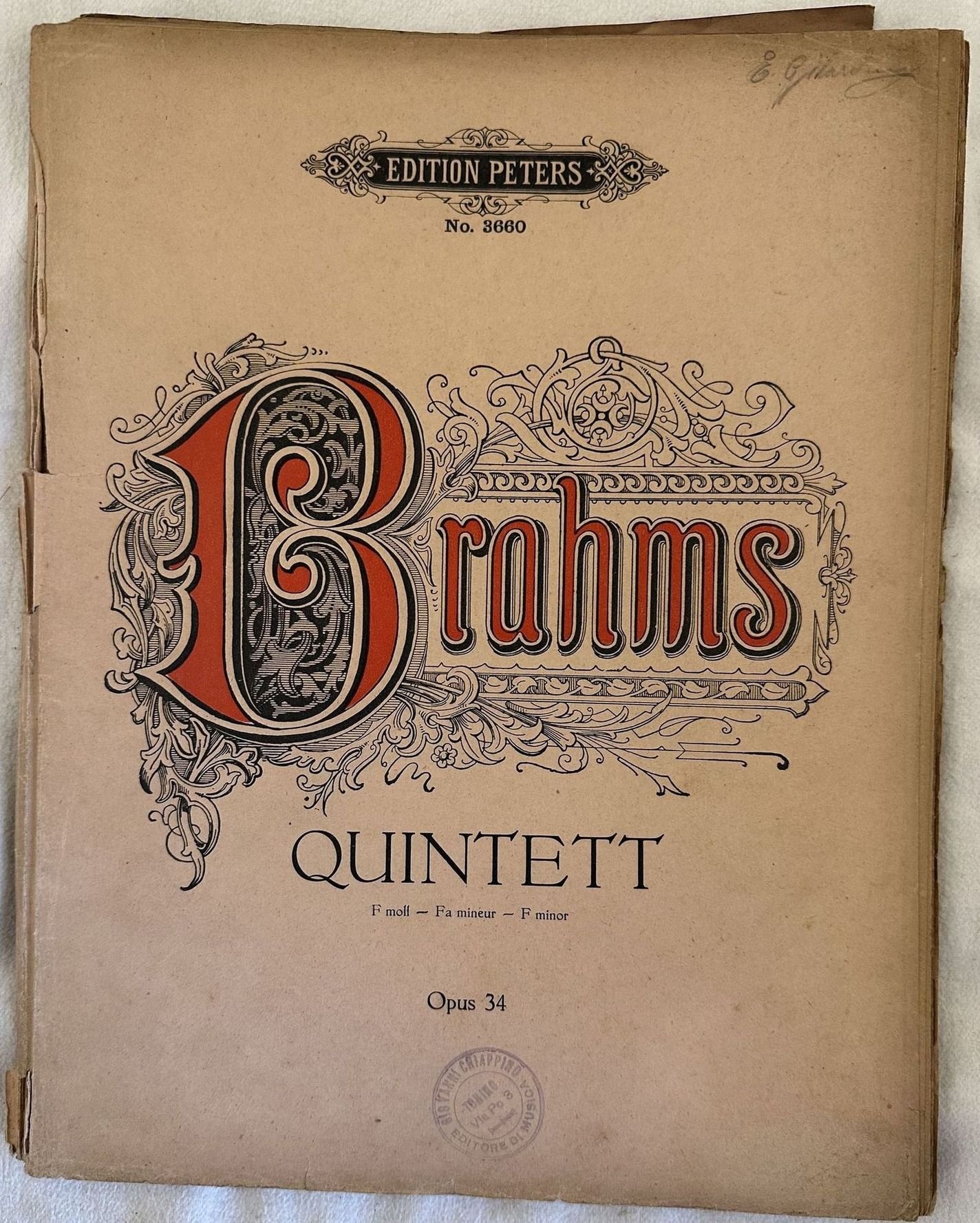 Edizione di inizio novecento della melodia "Quintett" dall'opera 34 del compositore e pianista tedesco Johannes Brahms (1833-1897). Partitura per quintetto: pianoforte, Violoncello violino n. 1 e n. 2, viola. In discrete condizioni. Copertina editoriale in discrete condizioni con usure marginali. Legatura quasi assente. Pagine in buone condizioni con rare fioriture. In Folio. cm. 31x24. Pp. 11, 9, 11, 10, 71.Edition of early 20th century of the melody "Quintett" from the opera 34 by the german composer Johannes Brahms (1833-1897). Scores for quintett: piano, Violoncello violin n. 1 e n. 2, viola. In fair conditions. Editorial cover in fair conditions lightly worn in the extremities. Binding almost lacks. Pages in good conditions with occasional foxing. In Folio. cm. 31x24. Pp. 11, 9, 11, 10, 71.<BR><BR>