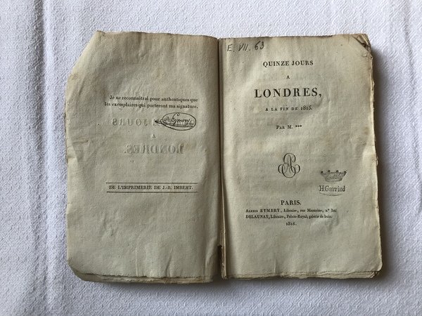 PRIMA EDIZIONE. In-8, pp. 214. Copia in barbe legata in brossura coeva con titolo stampato su etichetta cartacea al dorso. Firma dell'editore e stampatore Alexis Eymery al verso dell'occhietto, a comprovare l'autenticità dell'edizione. Timbro di possesso al frontespizio di H. Garriod (nome sormontato da corona). Cerniere un poco indebolite, ma legatura ancora ben salda. Angoli delle carte iniziali e finali con leggeri segni di usura. Una copia molto buona. Resoconto delle impressioni di un turista francese, ovvero Auguste Defauconpret, letterato e traduttore di water Scott, che visse per un periodo in Inghilterra. Quest'opera racconta di un suo soggiorno di quindici giorni a Londra. Fu accolta con poco calore in ambito anglosassone, vista la rivalità storica tra i due popoli, e recensita con sufficienza mista a velata permalosità in "The British Review, and London Critical Journal" (Londra 1816, Vol. VIII, pp. 209-218).