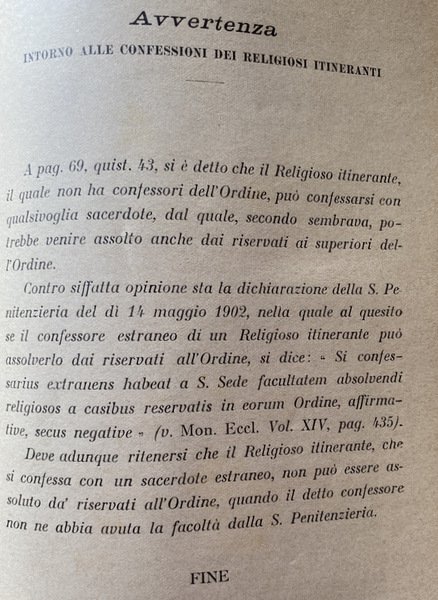 Sono, in gran parte, difficoltà nuove, non contemplate da Autori antichi, e chiarimenti sulle nuove disposizioni della S. Sede, onde questa, con vigile premura, provvede alle necessità dei tempi nostri. E poiché la disciplina della Chiesa va spesso soggetta a mutazioni, secondo le varie esigenze dei tempi che mutano, perciò è stato necessario ritoccare le soluzioni da noi date altra volta, ed in taluni casi anche mutarle, giusta le mutate norme venuteci dalla S. Sede. Anzi giova qui avvertire che, cominciata la stampa di questo libro prima del Decreto ultimo del S. Officio sulla legge del Digiuno e dell'Astinenza, parecchie cose non si trovano conformi al detto Decreto; in ultimo però daremo il Decreto medesimo in Appendice con un opportuno commento.