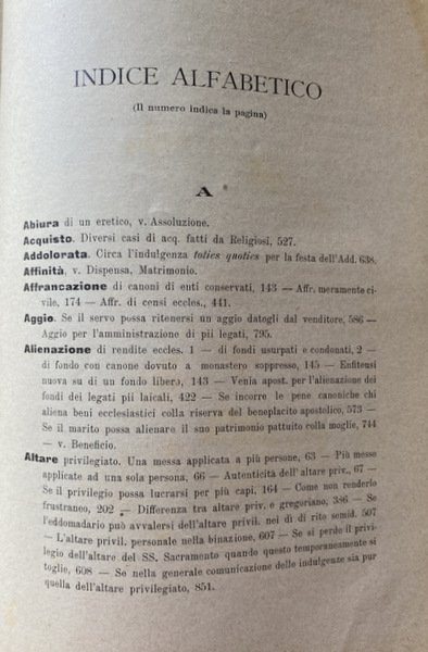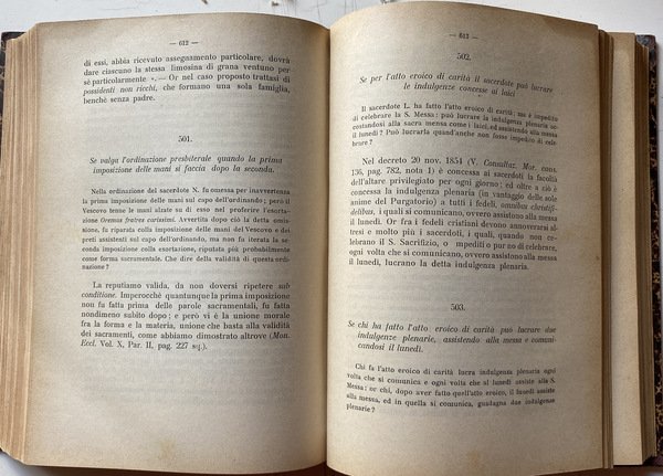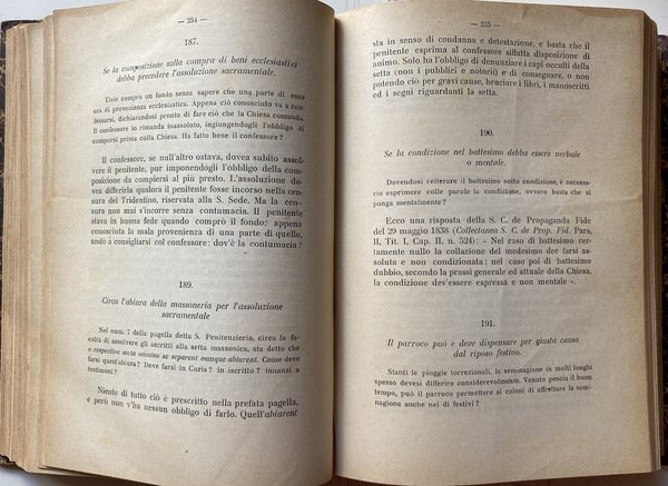 Soggetti: Teologia morale, Diritto canonico, Questioni morali, Etica, Filosofia, Monitore ecclesiastico, Dottrina cattolica, Pratica religiosa, Vita religiosa, Cristianesimo, Cattolicesimo, Doveri morali, Digiuno, Usurpatori dei beni dei sacri, Abiura, Indulgenze, Società operaie, Benedizione, Confessori, Confessione, Peccato, Peccati, Fedeli, Messa, Penitenza, Affrancazione, Consultazioni, Liturgia, Codex iuris canonici, Codici, Comportamento, Norme comportamentali, Pastorale, Magistero, Clero, Chiesa, Gerarchie ecclesiastiche, Norme giuridiche, Questioni liturgiche, Decreti, Studi giuridici, Novecento, Libri antichi, Libri rari, Collezionismo, Riferimento, Bibliografia, Consultazione, Opere religiose, Questioni teologiche, Amministrazione, Rendite, Beni sacri, Proprietà, Fondi, Confraternite, Feste religiose, Pasqua, Venerdì santo, Giovedì, Domenica, Santo Ufficio, Messe solenni, Natale, Natività, Celebrazioni, Obblighi, Preti, Sacerdoti, Sacerdozio, Matrimonio, Parroci, Pro sponsis, Sacramenti, Battesimo, Eucaristia, Comunione, Messa nuziale, Stipendio, Offerte, Donazioni, Officio, Officianti, Refezione serotina, Banche private, Vescovi, Pontefice, Papa, Pro populo, Monasteri, Clausura, Abiura, Eresie, Eretici, Diocesi napoletane, San Gennaro, Cresima, Madrina, Patrino, Padrino, Suore, Defunti, Ordini religiosi, Pene, Decreto Quemadmodum, Concilio, Famiglia, Vigilanti Studio, Cibo, Alimentazione, Astinenza, Suffragio, Rosario, Assoluzione, Periculo mortis, Dispense, Precetti, Oratorio, Regole, Patrimonio, Lucro, Legittima, Testamento, Calice, Acqua santa, Voti, Vendita, Carità, Giurisprudenza, Via crucis, Esercizio, Disciplina, Cibi, Pesce, Brodo, Elemosina, Decime, Tasse, Stato, Viaggio, Spese, Debiti, Fonti giuridiche, Censura, Riti, Culto, Rituali, Costituzione, Itineranti, Alienazione, Altare, Carne, Avvento, Bolla della Crociata, Commenti, Binazione, Divorzio, Dispensa, Usura, Scomunica, Sollecitazione, Porziuncola, Terziari, Francescani, Simonia, Latino, Rivelazione, Prescrizione, Orsoline, Ostia, Monache, Mese mariano, Eddomadario, Ebdomadario, Sponsali, Annotazioni, Sacra Congregazione dei Riti, Quemadmodum Deus, Documenti papali, Bolle, Motu proprio, Quam singulari, Concilio Lateranense, Trento, Catechismo, Encicliche, Acerbo nimis, Pio X, Concilio Ecumenico Vaticano, Gregorio XVI, Clemente XIII, Ubi nos, Mirari Vos, Codificazioni, Codici commentati, Commentarii cattolici, Questions de morale, de droit canonique et de liturgie, Pietro Gasparri, Giuristi, Codificazione, Codex iuris canonici, Scienze giuridiche, Costituzioni, Facoltà teologica, Biblioteca, Da collezione, Bibliofilia, Officiorum, Modernariato, Moral Theology, Canon Law, Moral Issues, Ethics, Philosophy, Ecclesiastical Monitor, Catholic Doctrine, Religious Practice, Religious Life, Christianity, Catholicism, Moral Duties, Fasting, Usurpers of Sacred Goods, Abjuration, Indulgences, Workers' Societies, Blessing, Confessors, Confession, Sins, Faithful, Penance, Liberation, Consultations, Liturgy, Codes, Behavior, Behavioral Juridical norms, Pastoral, Magisterium, Clergy, Church, Ecclesiastical hierarchies, Liturgical issues, Decrees, Legal studies, Twentieth century, Ancient Vintage rare books, Collectibles, Reference, Bibliography, Consultation, Religious works, Theological issues, Administration, Income, Sacred goods, Property, Funds, Brotherhoods, Religious Holidays, Easter, Good Friday, Thursday, Sunday, Holy Office, Masses solemn, Christmas, Nativity, Celebrations, Obligations, Priests, Priesthood, Marriage, Parish priests, Sacraments, Baptism, Eucharist, Communion, Wedding Mass, Salary, Offers, Donations, Office, Officiants, Evening meals, Private banks, Bishops, Pontiff, Pope, Monasteries, Cloister, Heresy, Heretics, Neapolitan Dioceses, Confirmation, Godmother, Patron, Godfather, Sisters, Dead, Religious orders, Penalties, Quemadmodum Decree, Council, Family, Food, Nutrition, Abstinence, Suffrage, Rosary, Absolution, Handouts, Precepts, Oratory, Rules, Heritage, Profit, Legitimate, Testament, Chalice, Holy water, Vows, Sale, Charity, Jurisprudence, Exercise, Discipline, Food, Fish, Broth, Alms, Tithes, Taxes, State, Travel, Expenses, Debts, Legal sources, Censorship, Rites, Worship, Rituals, Constitution, Itinerants, Alienation, Meat, Advent, Bull of the Crusade, Comments, Bination, Divorce, Pantry, Usury, Excommunication, Solicitation, Tertiaries, Franciscans, Latin, Revelation, Prescription, Ursulines, Host, Nuns, Marian month, Eddomadary, Hebdomadary, Sponsals, Annotations, Congregation of Rites, Papal Documents, Bulls, Lateran Council, Catechism, Encyclicals, Pius X, Vatican Ecumenical Council, Gregory, Clement, Codifications, Commented Codes, Catholic Commentaries, Jurists, Codification, Legal sciences, Constitutions, Theological Faculty, Library, Collectible, Bibliophilia, Modernism