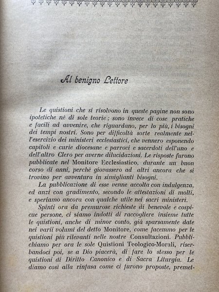 Le quistioni che si risolvono in queste pagine non sono ipotetiche nè di sole teorie; sono invece di cose pratiche e facili ad avvenire, che riguardano, per lo più, i bisogni dei tempi nostri. Sono per difficoltà sorte realmente nell'esercizio dei ministeri ecclesiastici, che vennero esponendo capitoli e curie diocesane e parroci e sacerdoti dell'uno e dell'altro Clero per averne dilucidazioni. Le risposte furono pubblicate nel Monitore Ecclesiastico, durante un buon corso di anni, perchè giovassero ad altri ancora che si trovino per avventura in simiglianti bisogni.