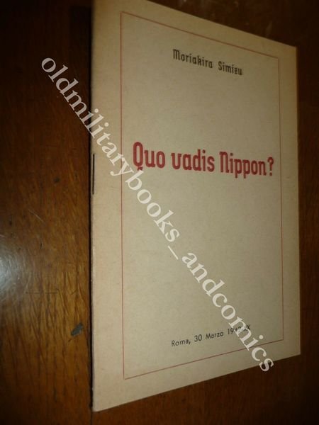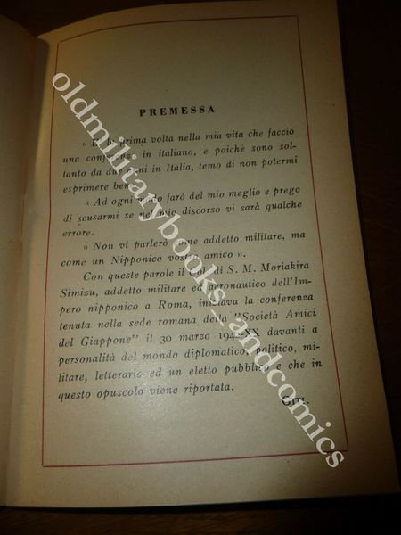DESCRIZIONE: Off. Pol. Laziale Roma 1942 br. ed. pp. 24 in 16°. Discorso tenuto dal Colonnello MORIAKIRA SIMIZU addetto militare ed aeronautico dell'Impero nipponico a Roma, nella sede romana della "Società Amici del Giappone" il 30 marzo 1942. CONDIZIONI: Perfette. PESO / WEIGHT: 22 gr. without package