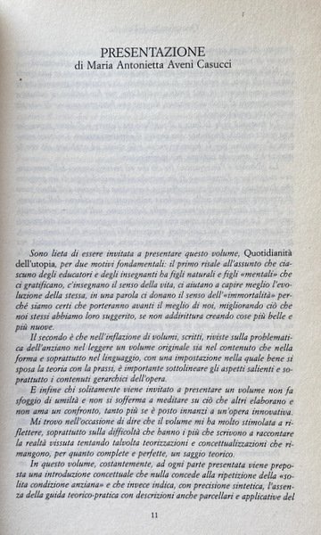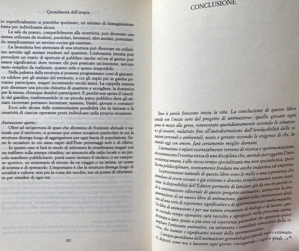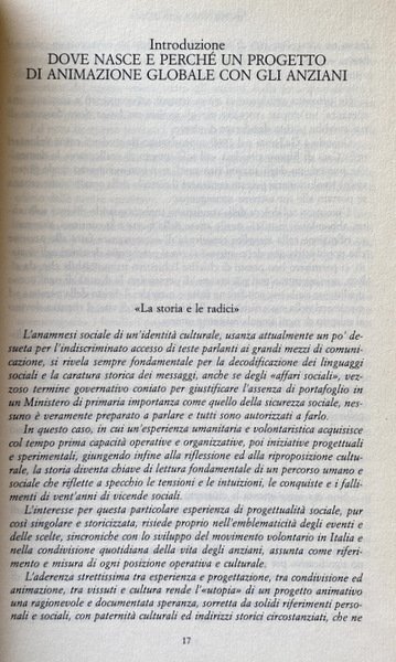 «.L'animatore vero, che non conferma e afferma se stesso, renderà valido chi è considerato invalido, partecipe chi è normalmente escluso, utile a sé e agli altri chi non è considerato in un disegno collettivo e di comunità, sia in una dimensione di intervento ludico, sia ne recuperare e innalzare il livello di autostima di chi spesso è solo preda della depressione e della rinuncia. Lasciamo al lettore di scoprire altrettanti capitoli e paragrafi interessanti e piacevoli, di attivare la sua curiosità anche senza seguire una lettura ordinata suggerita dall'indice e speriamo fortemente che l'opera non sia soltanto una guida agli animatori e a chi li forma, una lettura che dà conoscenze superficiali e nemmeno soltanto formative e culturali nel senso più ampio del termine, ma soprattutto crei proseliti, stimoli ambizioni e aiuti la creatività dei più illuminati fino ad una scelta di attività di animatore ora nel microcosmo familiare e domestico, ora ad una scelta di studio e formazione per una professionalità seria ed impegnata e, perché no, scientifica.». (dalla presentazione di Maria Antonietta Aveni Casucci. Professore associato di Psicologia, direttore della sezione di Psicogerontologia dell'Istituto di Psicologia della facoltà medica dell'Università Statale di Milano).