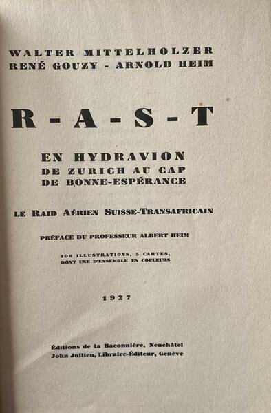 R-a-s-t en hydravion de Zurich au Cap de Bonne Sperance. Le raid aèrien suisse-transafricain. Preface du professeur Albert Heim